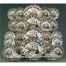 An Ashworth ironstone comprehensive dinner service, printed and painted with oriental flowers and fencing in the Imari style in iron red, blue, yellow and gilt, comprising eighty plates in sizes, twenty-one soup plates, ten oval meat dishes in sizes, three vegetable dishes and covers, a soup tureen and stand (no cover), sauce tureen and two stands, two smaller stands, a venison dish and a cheese stand, mostly impressed 'Ashworth Real Ironstone China' and printed mark in blue (some variation in pattern) (127)