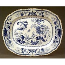An ironstone large rectangular meat dish, printed with flowers and coat of arms in blue, 21in wide, marked with royal arms and 'Du Croz, Skinner Street, London, Stone China 51', c.1825-30