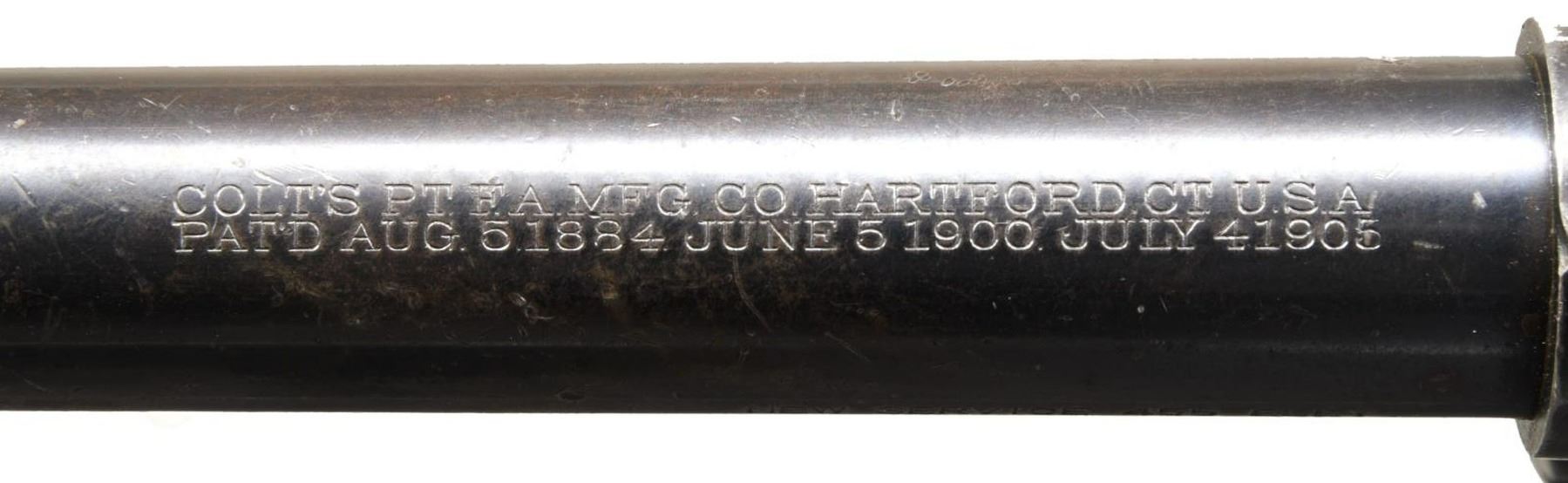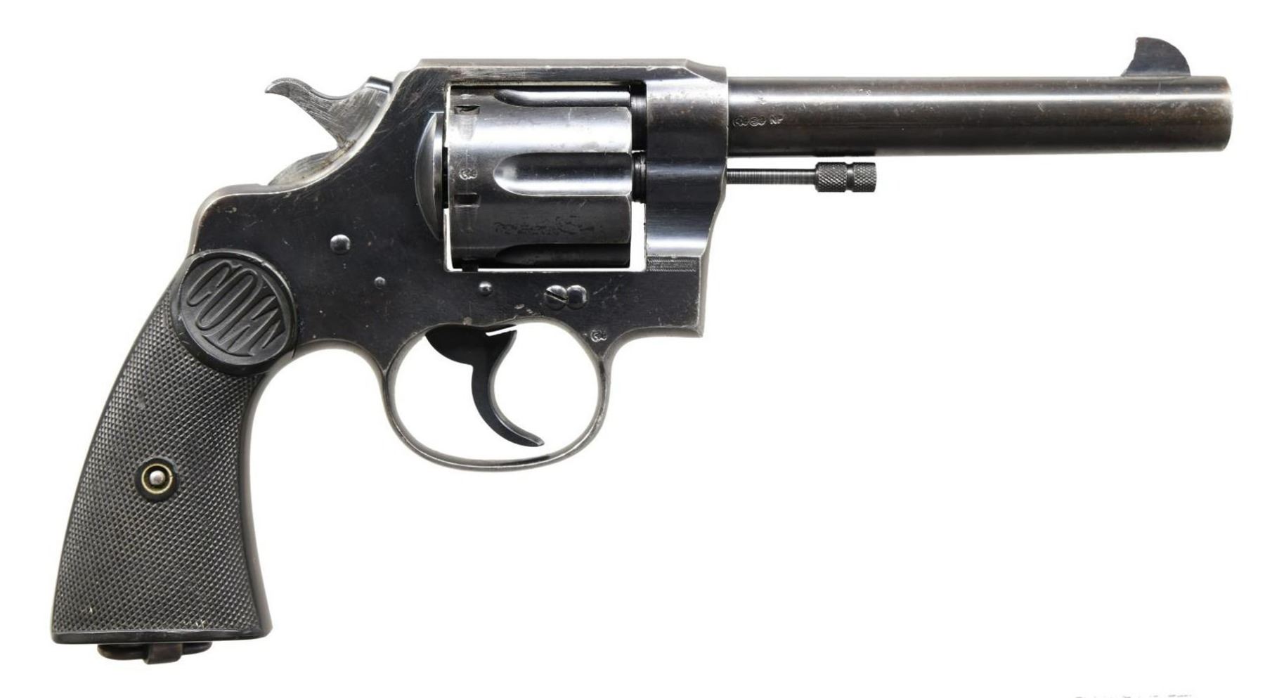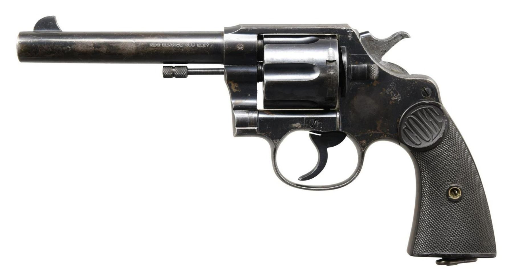 REVOLVER. Cal. 455 Eley. S# 141507. Bbl. 5 1/2". New Service DA revolver mfg. by Colt in 1917. The left side of the bbl. is marked "NEW SERVICE 455 ELEY", with Colt's 2 line address across the top. Left side of frame exhibits the Rampant Colt logo and "VP" proof. Frame, cyl., and bbl. exhibit various British proofs, with the right side of the frame being marked "NOT ENGLISH MAKE". Metal components are blued, with the frame being mounted with 2 piece "COLT" checkered hard rubber grips. Interior of right grip panel exhibits a lightly scribed matching number to the frame. Clipped blade front sight with frame notched rear sight. CONDITION: metal components retain large amounts of their original factory blue finish, exhibiting areas of wear and thinning that show through to a pleasing brown patina, with scattered spots of light surface oxidation overall, as well as a couple spots of cleaned pitting. Mirror bore, retaining strong rifling throughout. Grips exhibit smoothing, with scattered marks and nicks overall. Left grip panel exhibits a mild loss on the bottom of the panel that does not appear to effect serviceability. PROVENANCE: The Collection of Gun Sport Ltd owned by Jon R. Thomas. (23-3958/MLW). CURIO. $800-1,200.
