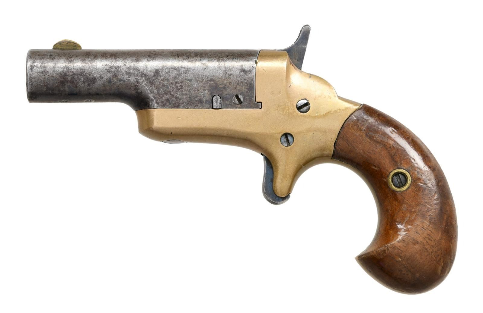 Cal. .41 RF. S# 12201. Bbl 2 1/2". Brass frame w/ case color hardened trigger and hammer. Iron bbl w/ brass half-moon front sight. 2 piece smooth wood birds head grips. Bbl marked "-COLT-" across the top w/ British "(Crown)/ V" and "(Crown)/ CP" proofs on underside. Matching numbers are present on the frame, bbl, and are handwritten on the interior of the grip panels. CONDITION: brass frame retains trace of its original nickel finish, now exhibiting a mellow patina. Bbl retains traces of its original blue finish w/ the balance exhibiting a mottled gray patina w/ some spots of oxidation. Very bright bore, exhibiting a few small scattered spots of pitting and strong rifling. Grips show wear to the varnish and some scattered handling marks, but are otherwise good. (01-23534/MLW). ANTIQUE. $300-500.