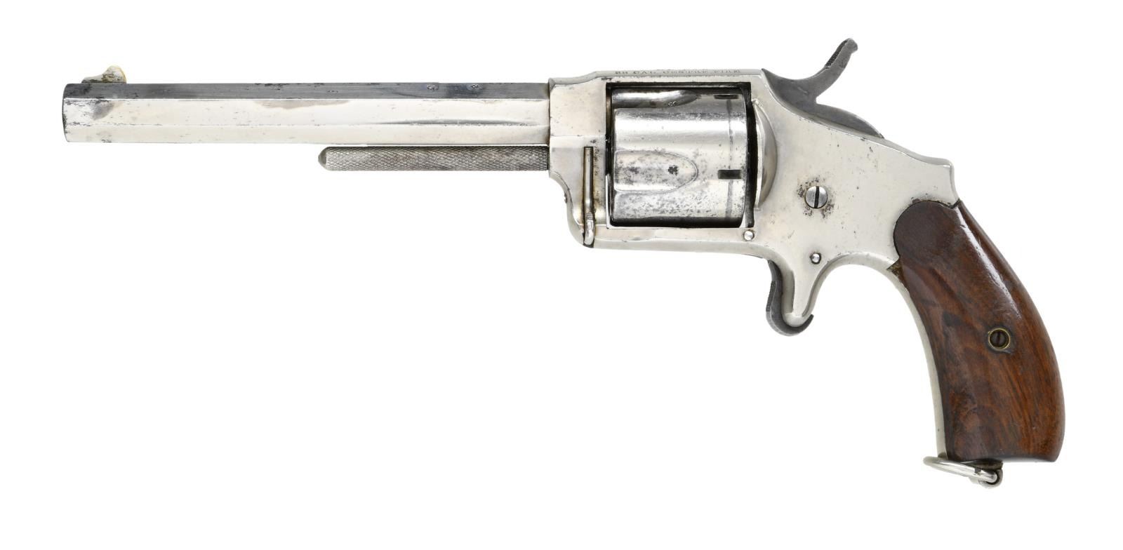 Cal. 38 CF. S# 8794. Bbl 5". No. 5 XL manufactured by Hopkins & Allen. Top strap is stamped with Allen & Hopkins patent information above the model and caliber designation. Barrel and cylinder bear British proofs. Frame, cylinder, and barrel exhibit a nickel plated finish, with the hammer and trigger being case color hardened. Frame is mounted with 2 piece smooth wood grips. Matching numbers are present on the frame, cylinder, barrel, and is handwritten in pencil on the interior of the right grip panels. CONDITION: metal components retain the majority of their original factory nickel finish, exhibiting areas with wear, flaking, and losses that show through to some dark discoloration, gray patina, and some mild pitting overall. Bore exhibits scattered areas of pitting and good rifling throughout. Grips show some wear to the varnish and some scattered marks from storage and handling, but are otherwise sturdy and serviceable. (01-23921/MLW). ANTIQUE. $300-500.