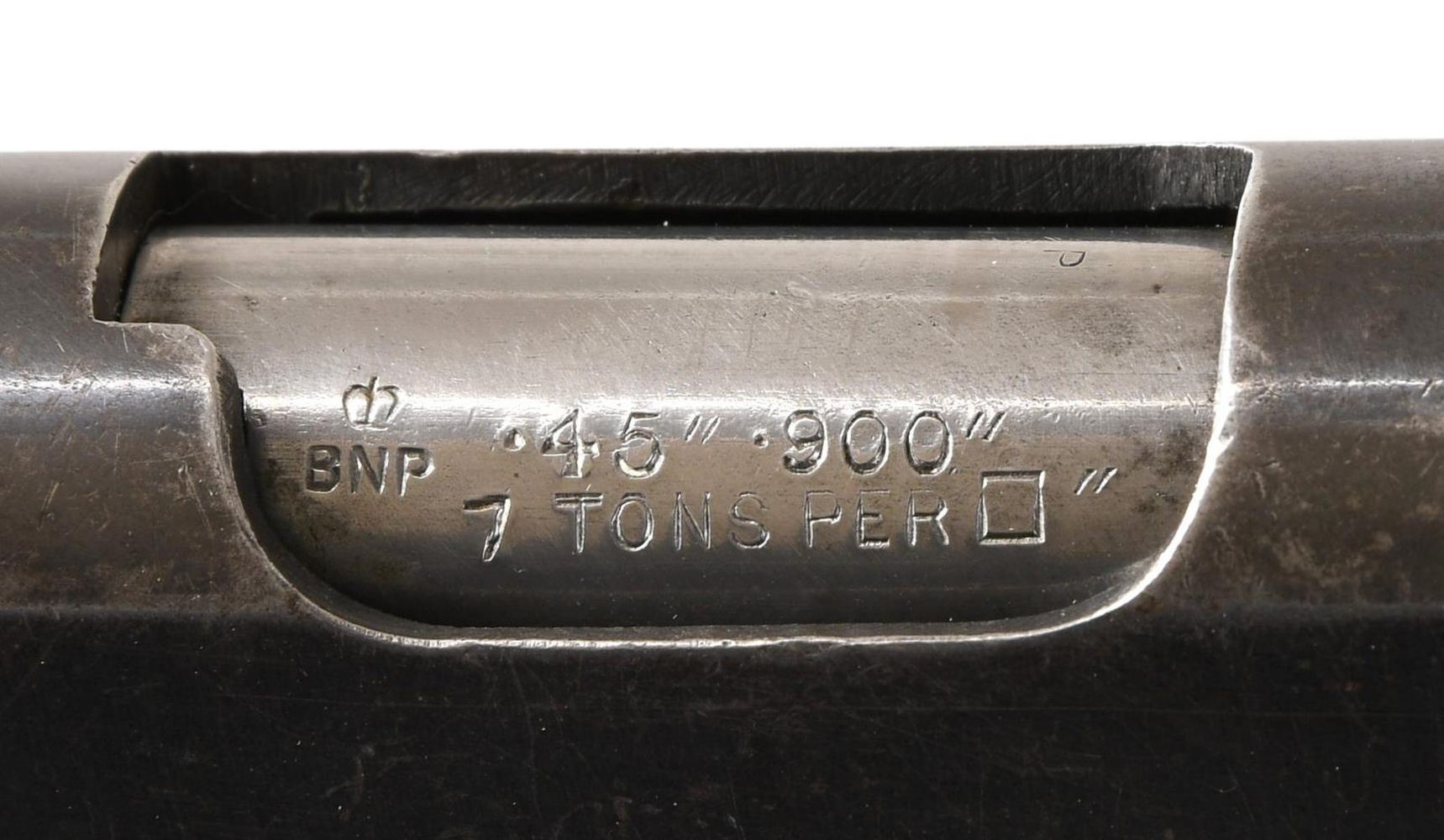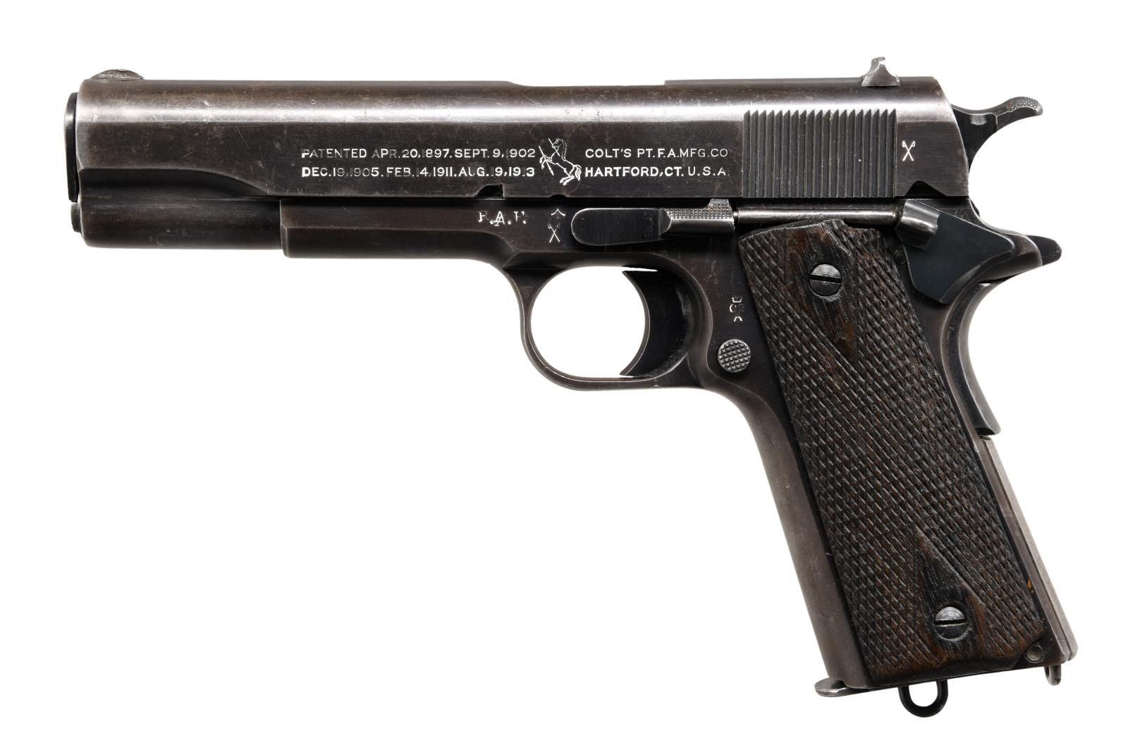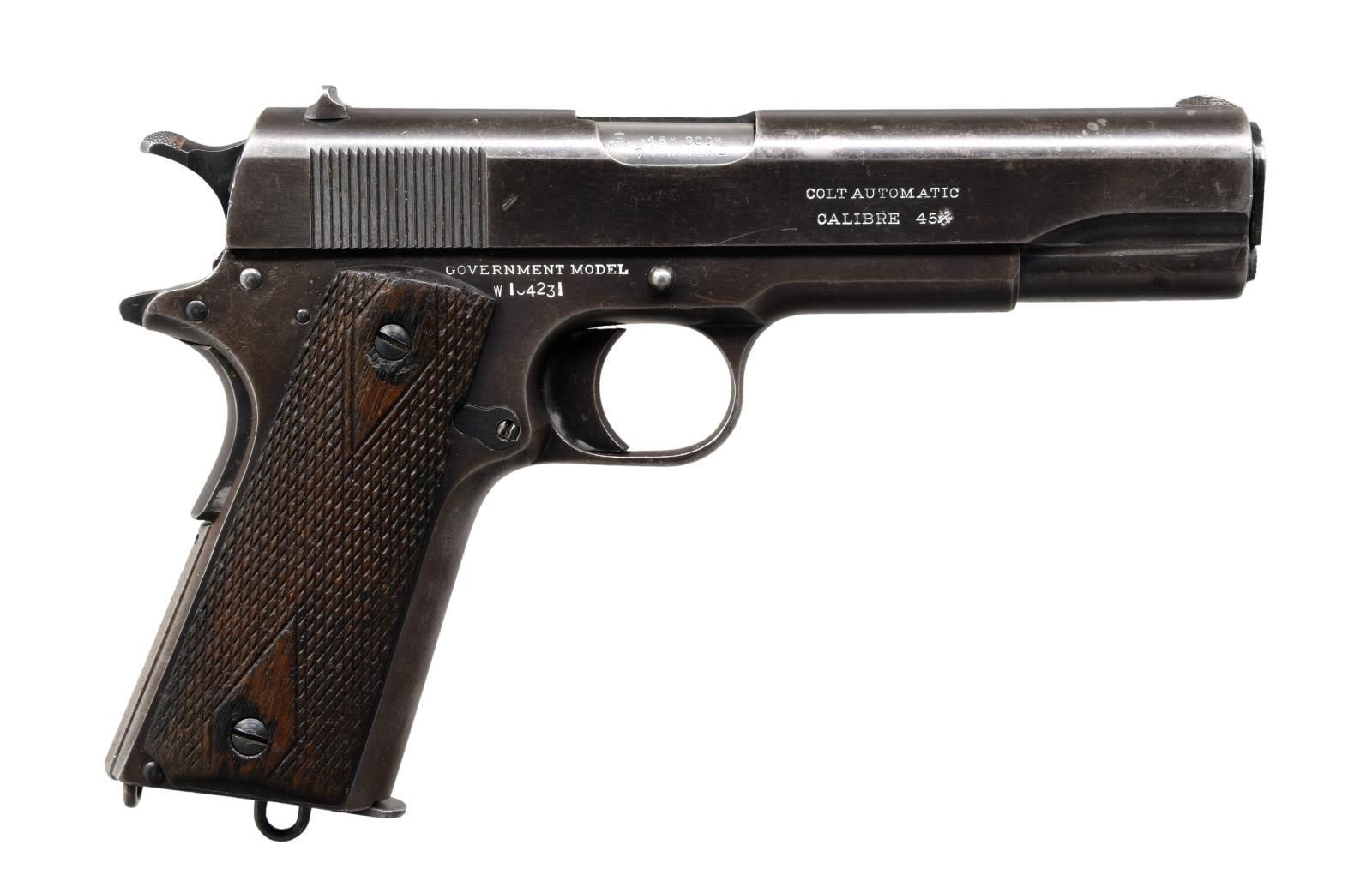 PISTOL. Cal. 45 ACP (originally 455 Eley). S# W104231. Per "Colt .45 Government Models (Commercial Series)" by Charles W. Clawson, this pistol was originally purchased as part of Contract No. U.S. 1139-MM67, dated January 2, 1918; this pistol was delivered approx. between Sept. 10, 1918, and March 11, 1919. Left side of the frame and slide have Colt factory "crossed pennant" proofs. Left side of the frame has the "R.A.F" proof (the "A" double stamped), broad arrow, and "crown over G2 over A" G. W. R. Stedman, British Army Inspector of Small Arms, proof. Colt Government model commercial features, including a replacement 5" Colt commercial barrel marked "BNP .45 .900 / 7 TONS PER"; markings mandated by the Proof Act of 1955. Right side of the slides has an added Birmingham proof over a second "5" in the caliber marking. Two-piece double-diamond-checkered walnut grips. MAGS: 1 two-tone 7-rd. with lanyard loop marked "455 / ELEY". CONDITION: frame and slides have a fair original blue finish showing faded blue mixed with patina and marks. Front sight shows impact dents. Replacement extractor. Good grips show worn checkering near the butt. Good bore with light pitting. PROVENANCE: the collection of Curtis H. Halvorson. (23-5879/MD). CURIO. $2,000-3,000.