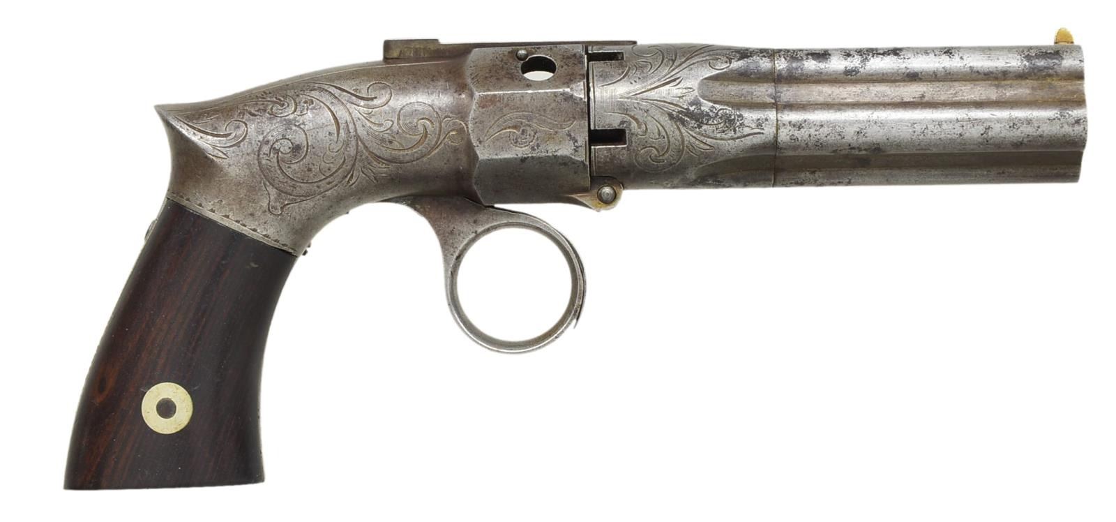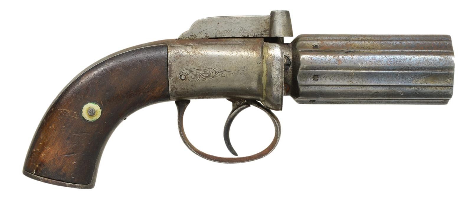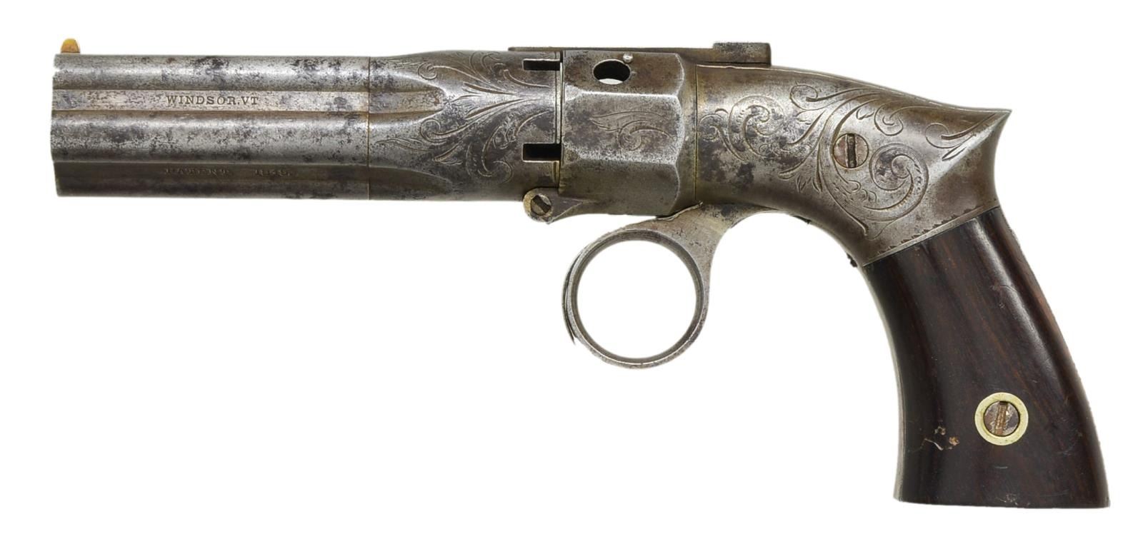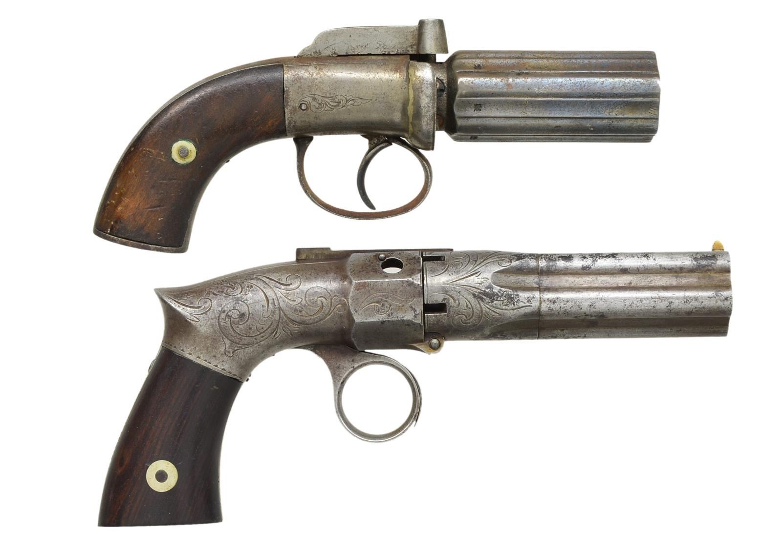 1) BRITISH PROOFED BAR HAMMER. Cal. 36. S# ING3510. Bbl. 3 1/2" six shot ribbed cluster w/ smooth bores. Rnd. bodied boxlock action w/ integral nipple shield, bar hammer & conventional trigger. Action has highlights of scroll engraving. Bbl. ribs. are British proofed. 2 Piece walnut grips. CONDITION: metal is fading to gray/brown showing surface corrosion & retaining a sm. amount of original silver action finish in protected areas. Action cycles properly. Bores show scattered pitting. 1 Bbl. has flat spot at muzzle. Grips have worn appearance w/ dents & handling marks. (01-18920/DS). 2) ROBBINS & LAWRENCE RING TRIGGER. Cal. 28. S# 5022. Bbls. 3 5/8" five shot fluted cluster w/ rifled bores. Flutes marked "ROBBINS & LAWRENCE CO. WINDSOR, VT / PATENT 1849". German silver blade front sight w/ rear sighting groove on bbl. release lever. Bbl. tips down for loading. Saw handle rnd. body boxlock action. Breech end of bbl. cluster & action have scroll engraving. 2 Piece walnut grips. CONDITION: metal has a mottled gray brown appearance w/ spots of light pitting & corrosion. Action is cycling properly. Dark bores w/ some light pitting. Grips have age darkened appearance w/ handling marks. (01-18924/DS). BOTH ANTIQUE. $800-1,200.