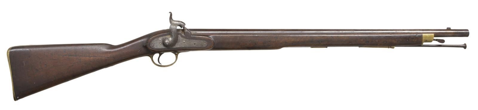 Cal. 65 Smoothbore. NSN. Bbl. 26". Tower lock dated 1847 w/ numerous proof & inspectors marks throughout. Lock "CROWN/VR & ARROW". Right side butt "BO/ARROW". Brass hardware include stock end cap, two ramrod pipes, trigger guard & buttplate. Large "41" deeply stamped left stock flat. Front sight w/ no provisions for a rear sight. Lowell's bayonet catch & ramrod. Trigger guard is missing the swivel. CONDITION: Poor hammer spring tension; action needs mechanical attention. Metal is a rust brown patina w/ scattered rust & fine pitting. Stock has numerous dings & dents mostly light w/ some moderate. Bore is fair, dark & rusty. PROVENANCE: From the Lifelong Collection of Glen E. Mattox. (01-22501/CW). ANTIQUE. $600-800.