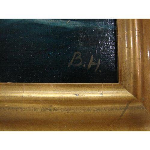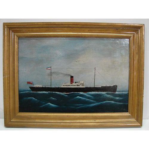 BRITISH SHIP PAINTING. Circa 1900. Oil on canvas painting depicts a steamship. Signed in lower right “B.H.” Painting is in gilt wood frame. 13” x 19”