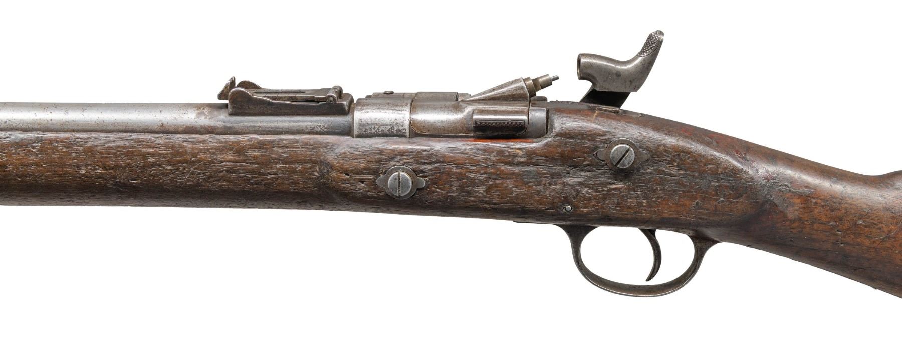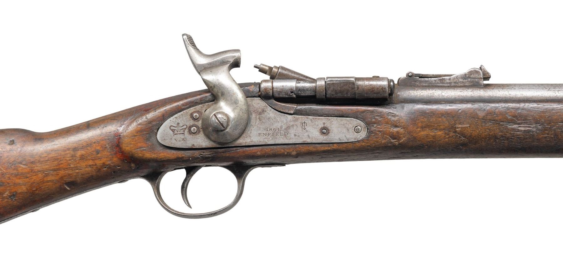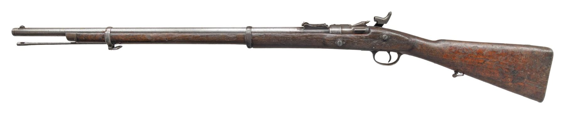 Cal. 577 Snider. NSN. Bbl. 30 1/2". Blade front sight. Ladder rear sight with faint English graduations. Top of action marked "I*". Lock has 1861 Enfield & crown "VR" markings. Front trigger guard screw missing. Hardwood stock with bottom mounted sling swivels. Ramrod present. CONDITION: stock shows overall heavy wear with flaking old finish throughout, a few cracks, scattered dings, handling marks & chipping. Metal has a cleaned silvery-gray appearance with areas being proud of wood, scattered oxidation, dings & pitting. Action functions properly when hand cycled. Pitted bore with evident rifling. (01-27411/MJC). ANTIQUE. $200-300.