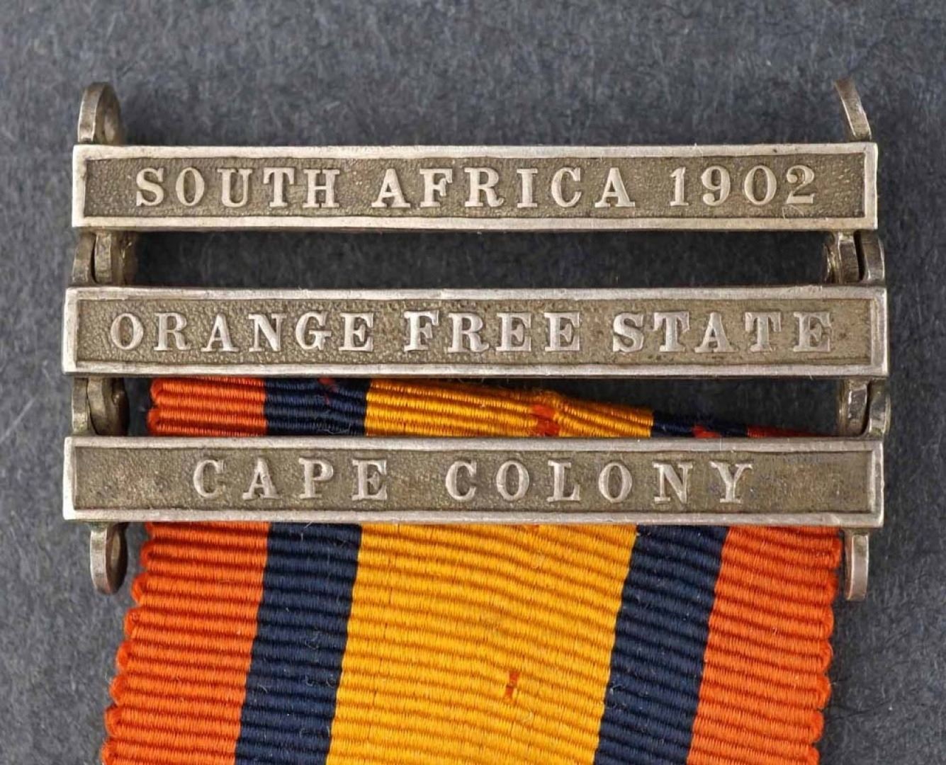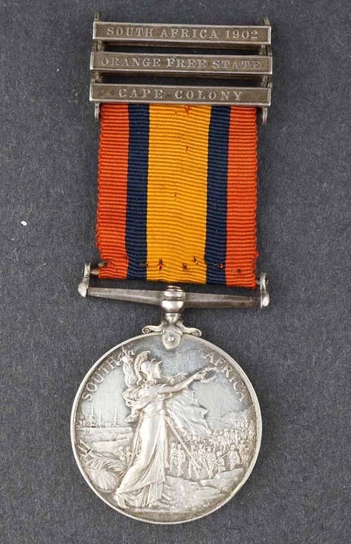British South Africa Military Medal with Three Bars : SOUTH AFRICA 1902, ORANGE FREE STATE, and CAPE COLONY. Shows signs of old, rather harsh cleaning. Engraving on edge is illegible.