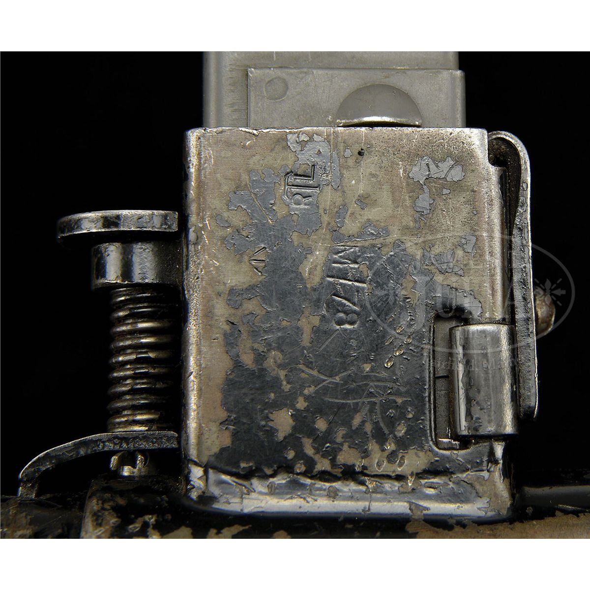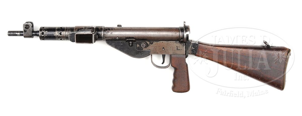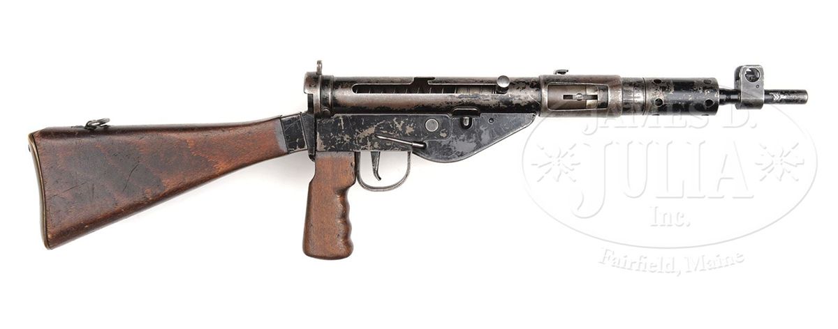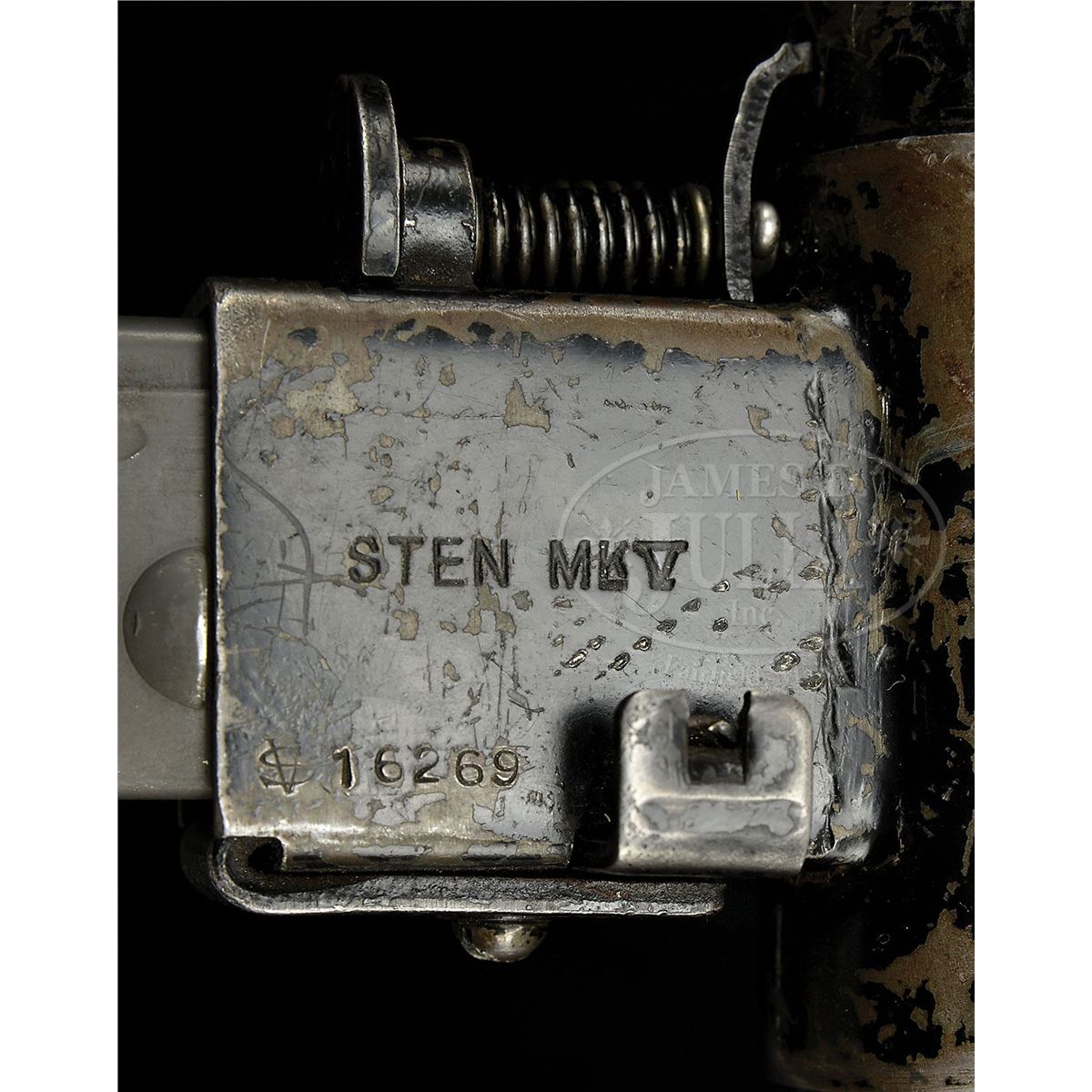 SN 16269. Cal. 9 mm. 7.8" bbl. This broad arrow proofed Sten has a bolt which is matching to the receiver and includes one gray Parkerized magazine marked "M634" and three 25 rnd magazines in a white canvas magazine pouch. Left side of receiver is also marked with broad arrow over a "4 G2 C". Detachable wooden buttstock with brass buttplate is SN 19691. Underside of mag housing is marked with broad arrow and logo "RTL". There is also "M/78". Firing mechanism functions smoothly when operated by hand. This weapon appears fully functional. The Sten was an extremely reliable and inexpensive to produce submachine gun. It was a mainstay of British forces during WWII worldwide, and although derided by Soldiers as crudely built, it was a very effective and successful submachine gun. The Mark V model, introduced at the end of WWII was better fitted and finished then the earlier models. PROVENANCE: Collection of Carl "Bill" Morrison. CONDITION: Overall black enamel finish is about 30%, most of it being forward of the mag housing and forward of the trigger guard. The balance is bare metal showing a nice soft patina. Mag finish is excellent, near 100% gray Parkerized finish. Wooden hand grip is fine with some handling marks, as is the wooden buttstock. Brass buttplate has marking "M/216" with broad arrow at top of heel. Bore is in need of a cleaning but shiny with significant frosting to the rifling. Bolt face also in need of cleaning but is very good with crisp edges. Interior of receiver also needs cleaning, with a brown patina and some pitting. This does not in any way effect the function of the action. Two of the 25 rnd magazines have a gray Parkerized finish, the other a deep lustrous blue finish. Magazine pouch, although soiled, is completely serviceable. Overall this weapon shows evidence of some significant use but this is to be expected of a Sten. No doubt this would make an excellent shooter that you could take to the range over and over, never worrying about detracting from its value, and have loads of fun. 4-48645 JWK2
