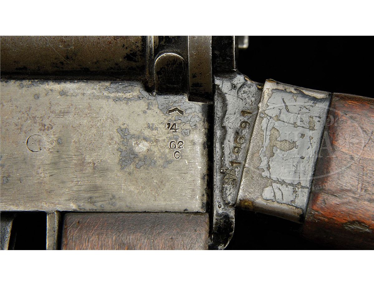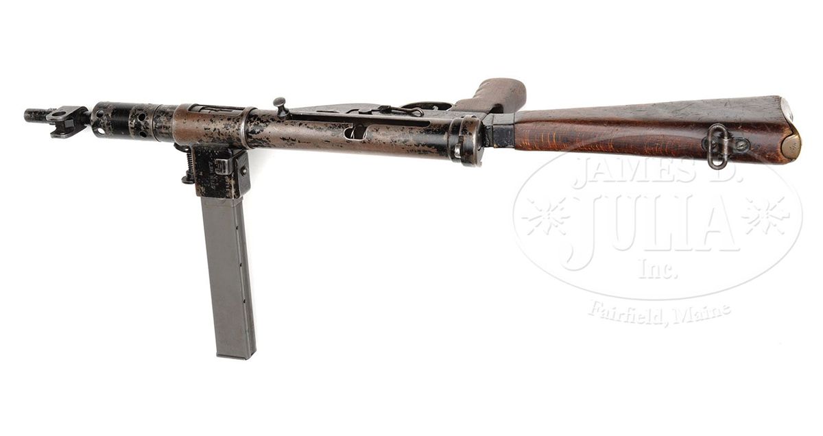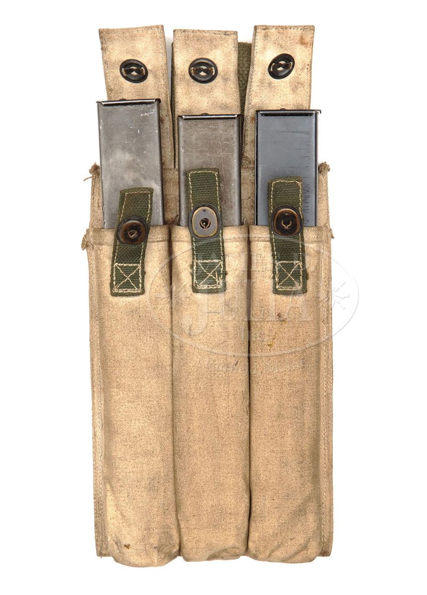 SN 16269. Cal. 9 mm. 7.8" bbl. This broad arrow proofed Sten has a bolt which is matching to the receiver and includes one gray Parkerized magazine marked "M634" and three 25 rnd magazines in a white canvas magazine pouch. Left side of receiver is also marked with broad arrow over a "4 G2 C". Detachable wooden buttstock with brass buttplate is SN 19691. Underside of mag housing is marked with broad arrow and logo "RTL". There is also "M/78". Firing mechanism functions smoothly when operated by hand. This weapon appears fully functional. The Sten was an extremely reliable and inexpensive to produce submachine gun. It was a mainstay of British forces during WWII worldwide, and although derided by Soldiers as crudely built, it was a very effective and successful submachine gun. The Mark V model, introduced at the end of WWII was better fitted and finished then the earlier models. PROVENANCE: Collection of Carl "Bill" Morrison. CONDITION: Overall black enamel finish is about 30%, most of it being forward of the mag housing and forward of the trigger guard. The balance is bare metal showing a nice soft patina. Mag finish is excellent, near 100% gray Parkerized finish. Wooden hand grip is fine with some handling marks, as is the wooden buttstock. Brass buttplate has marking "M/216" with broad arrow at top of heel. Bore is in need of a cleaning but shiny with significant frosting to the rifling. Bolt face also in need of cleaning but is very good with crisp edges. Interior of receiver also needs cleaning, with a brown patina and some pitting. This does not in any way effect the function of the action. Two of the 25 rnd magazines have a gray Parkerized finish, the other a deep lustrous blue finish. Magazine pouch, although soiled, is completely serviceable. Overall this weapon shows evidence of some significant use but this is to be expected of a Sten. No doubt this would make an excellent shooter that you could take to the range over and over, never worrying about detracting from its value, and have loads of fun. 4-48645 JWK2