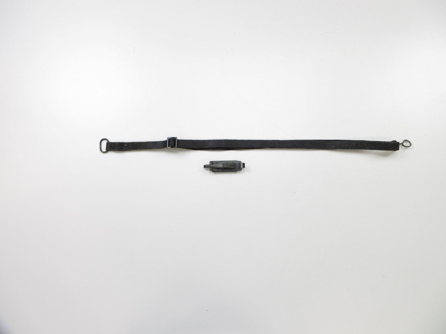 BRITISH STEN MKII SMG ACCESSORIES LOT. FITS VARIOUS 9MM MODELS, LOT INCLUDES; (1) MKI MAG LOADER & (1) LACK PAINTED P37 CANVAS WEB SLING WITH BRASS & STEEL FITTINGS, POSSIBLY FOR RIFLE REG'T OR ARMOURED USE, NO VISIBLE MARKINGS, OAL APPROX. 46.5". SEE PHOTOS.
