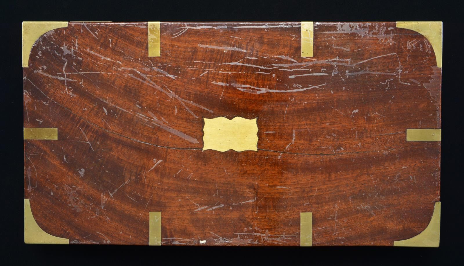 REVOLVER. 17x9x2.25" red baize lined brass bound mahogany veneered casing for 2 Colt navy revolvers and accessories, retains about 20 loose 36 cal. balls. CONDITION: fair to good overall, lining worn & soiled, glue repaired crack in lid, old varnish layer chipped and scratched. (02-19300/JS). $700-900.