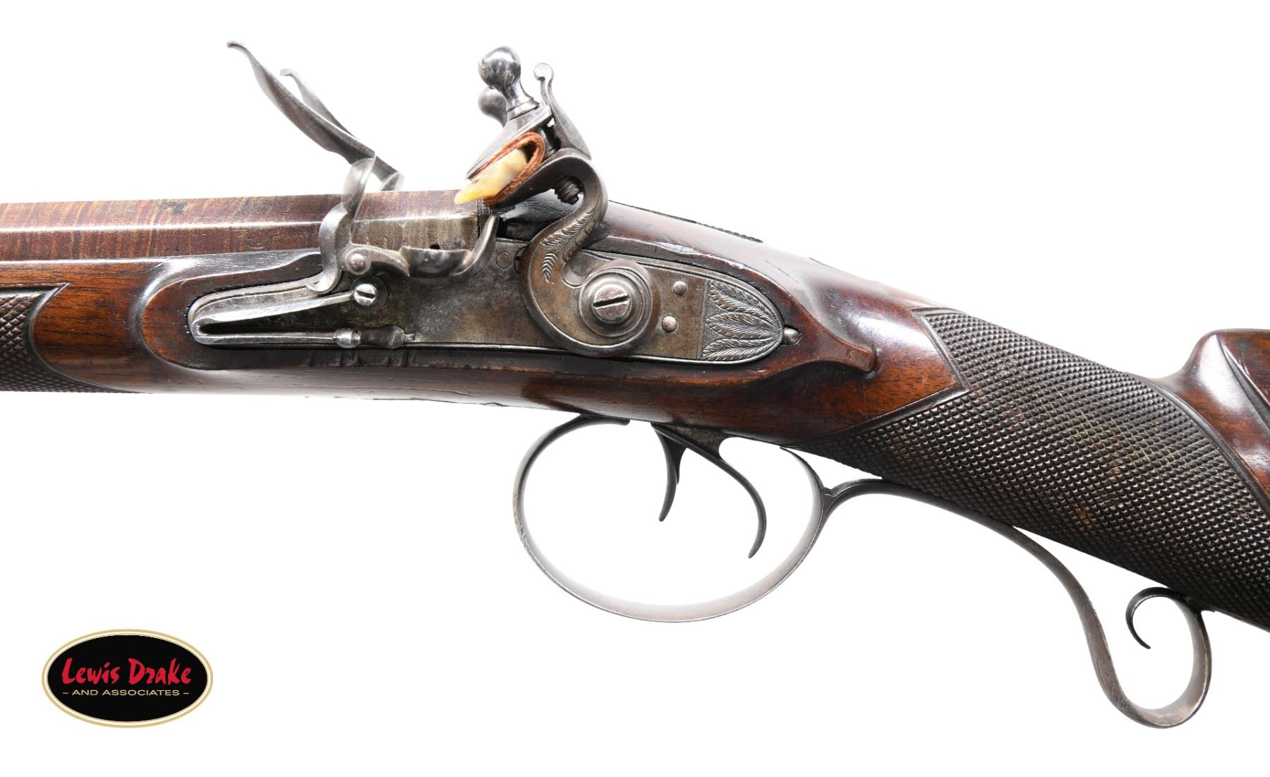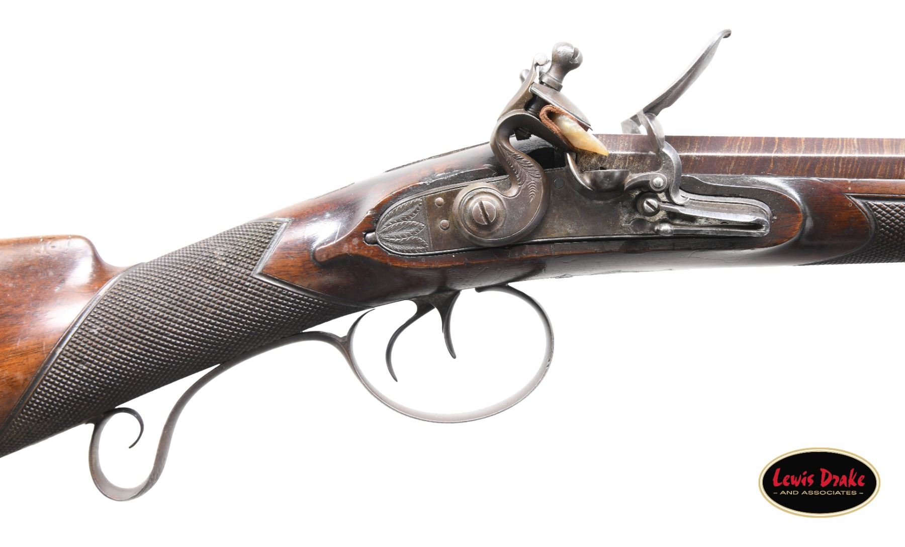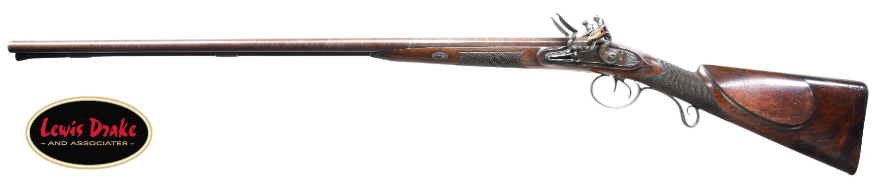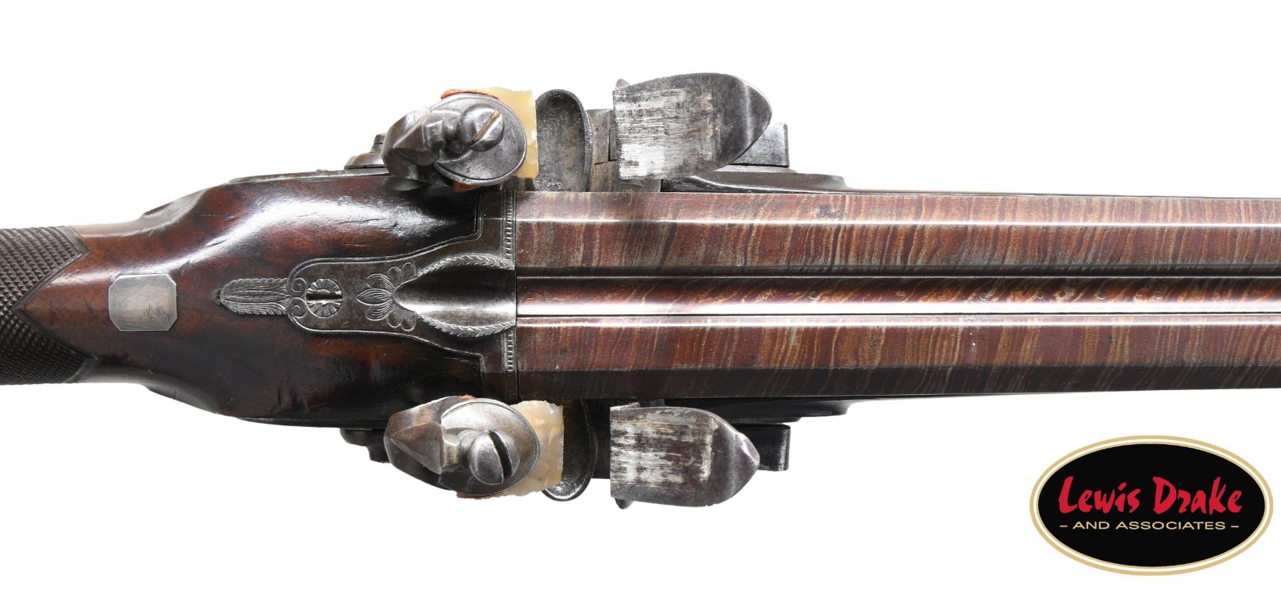 BARRELS AND LOCKS. Cal. 20 Bore. S# NSN. It appears this gun was finished in England using metal work from France or Belgium and has 32" twist barrels with deeply sunken rib. Barrels are octagonal at breech ends and transition to sixteen sided, then to round through wedding bands. Bottoms of barrels are stamped with various marks and initials which appear to be French. A Belgian mark is definitely on left flat. Bottoms are stamped with London black powder proofs both definitive and view. Breech iron has foliate engraving and deep sighting groove as often found on French guns. Locks have slightly chamfered arched plates with teats at rear and feature inset gull wing type semi-waterproof pans, bridled frizzens and rollers on feather springs with ball and spear finials. Serpentine cocks are line and foliate engraved and more foliage appears on lock tails. Classic British pineapple finials are on trigger plate and thimble. Trigger guard engraved with sea monster on bow has grip which terminates in a coil to support hand. Steel buttplate has long scroll engraved top tang which matches engraving on trigger guard but not breech iron or locks. Stock of dense European walnut has swept shadow line right hand cheekpiece and typical British square checkering at grip and forend. Stock attaches to barrels with captive side bolt through oval silver escutcheons. Ebony ramrod with horn tip mounts through two beaded pipe and matching thimble. MEASUREMENTS: STOCK: DAH: 2-3/16". DAC: 1-1/4"+. CAST: about 5/8" off. LOP: 14-5/8". WEIGHT: 6 lb. 15 oz. CONDITION: fine. Barrels retaining over 90% of what appears to be a dramatic re-brown. Locks are smooth gray brown which is possibly the result of a case hardening process. Stock retains most of its original oil finish. Furniture shows cleaning to light brown and gray. Bores are good with scattered pitting. Locks are fine and complete. Most likely this gun is a very good shooter. PROVENANCE: from the renowned collection of quality sporting arms from Lewis Drake together with inventory of Lewis Drake Associates. (01-26120/MGM). ANTIQUE. $3,000-6,000.