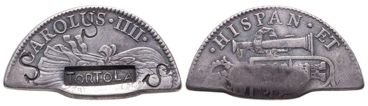 Tortola. 4 1/2 shillings. Type II countermark of TORTOLA in rectangle, struck on cut half of Spanish Colonial 8 Reales. 1801-1805. KM.10. Coin Very Fine, countermark Extremely Fine. Rare.