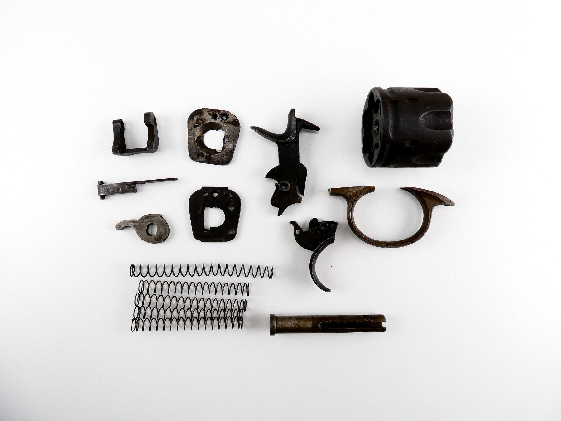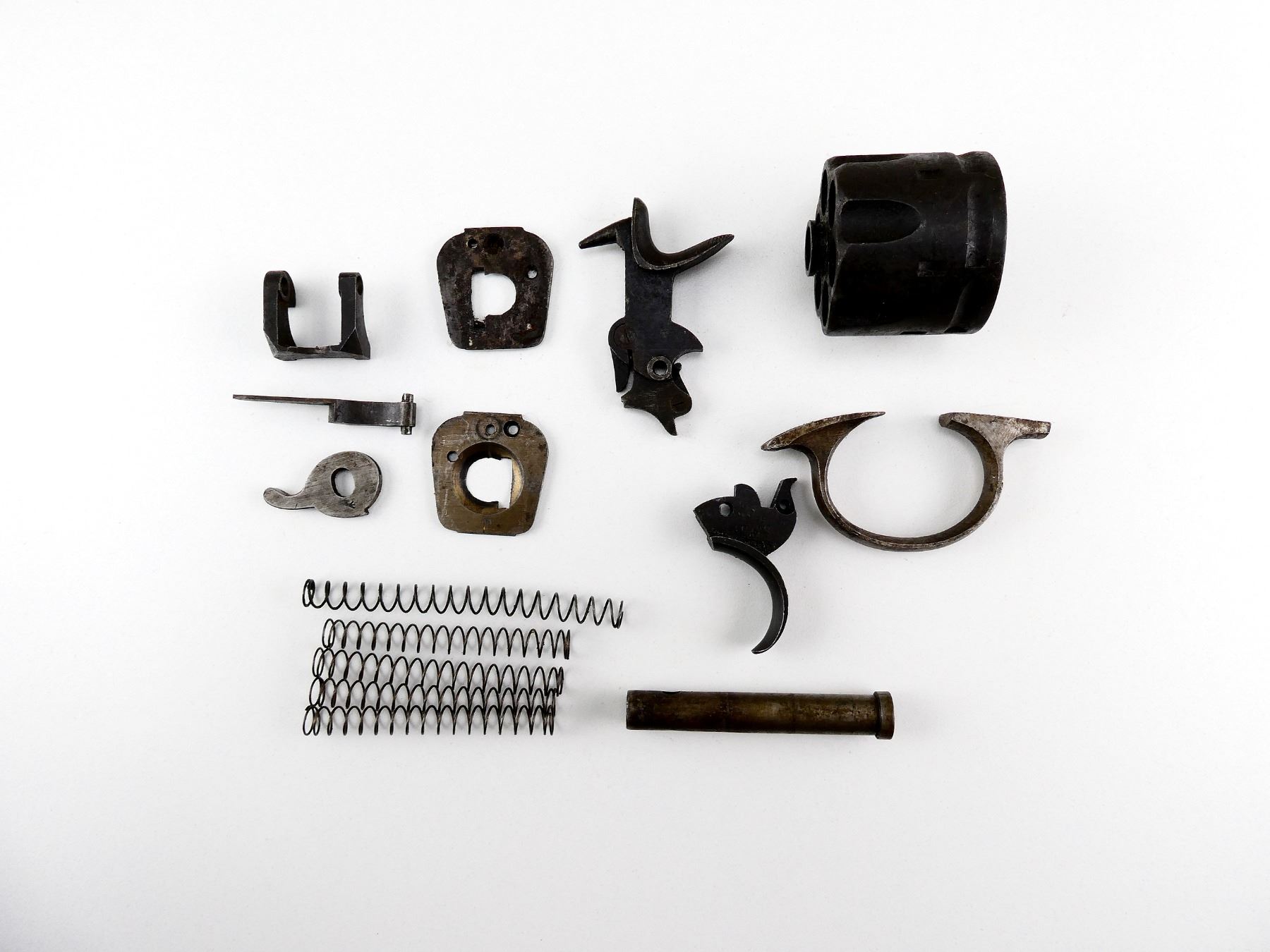 FITS .455 WEBLEY LARGE FRAME, LOT INCLUDES; HAMMER ASSEMBLY, TRIGGER, TRIGGER GUARD, (2) RECOIL PLATES, EXTRACTOR LEVER, CYLINDER CAM, AUXILIARY MAINSPRING, CYLINDER AXIS PIN, (4) EXTRACTOR SPRINGS, (1) .455 CYLINDER, ETC. MAY REQUIRE FITTING. SEE PHOTOS.