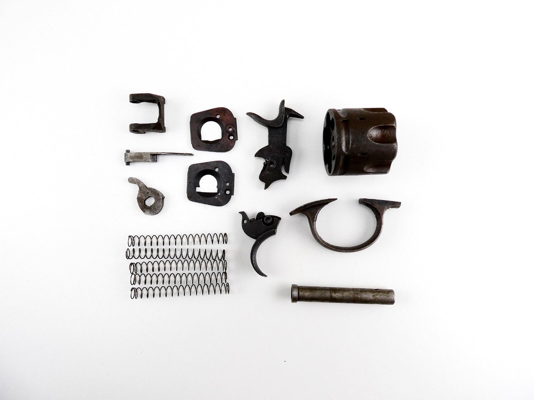 FITS .455 WEBLEY LARGE FRAME, LOT INCLUDES; HAMMER ASSEMBLY, TRIGGER, TRIGGER GUARD, (2) RECOIL PLATES, EXTRACTOR LEVER, CYLINDER CAM, AUXILIARY MAINSPRING, CYLINDER AXIS PIN, (4) EXTRACTOR SPRINGS, (1) .455 CYLINDER, ETC. MAY REQUIRE FITTING. SEE PHOTOS.