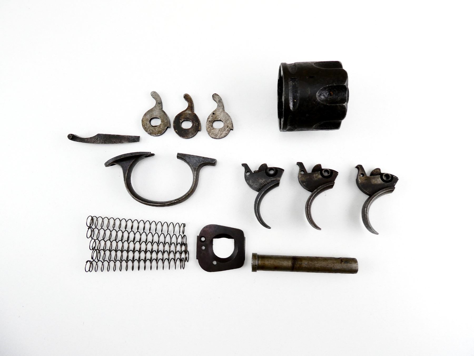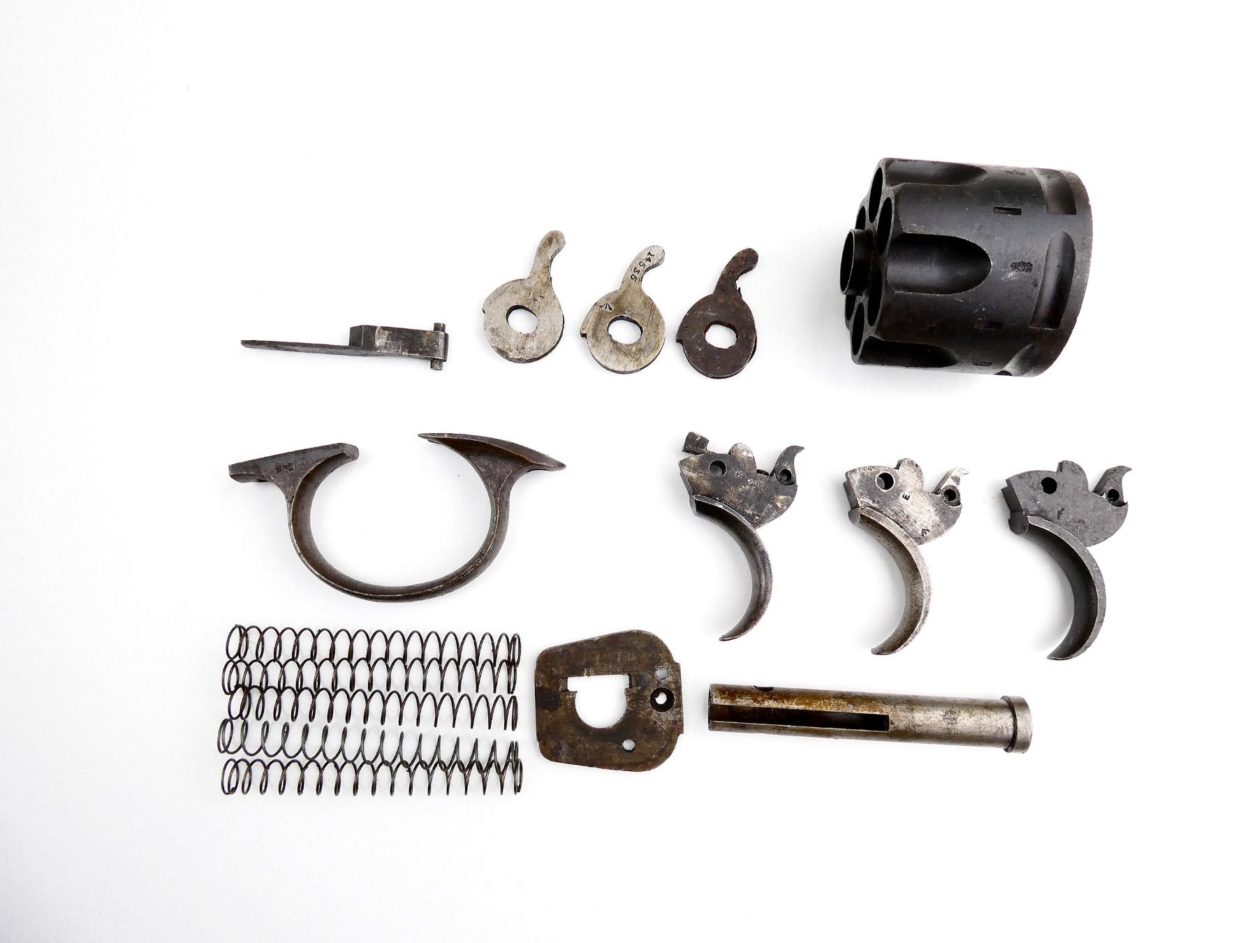 FITS .455 WEBLEY LARGE FRAME, LOT INCLUDES; CYLINDER, HAND, (3) TRIGGERS, TRIGGER GUARD, RECOIL PLATE, (3) EXTRACTOR LEVERS, (5) EXTRACTOR SPRINGS, CYLINDER AXIS PIN, ETC. MAY REQUIRE FITTING. SEE PHOTOS.