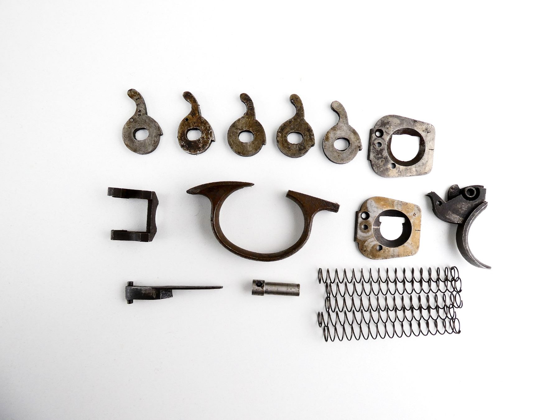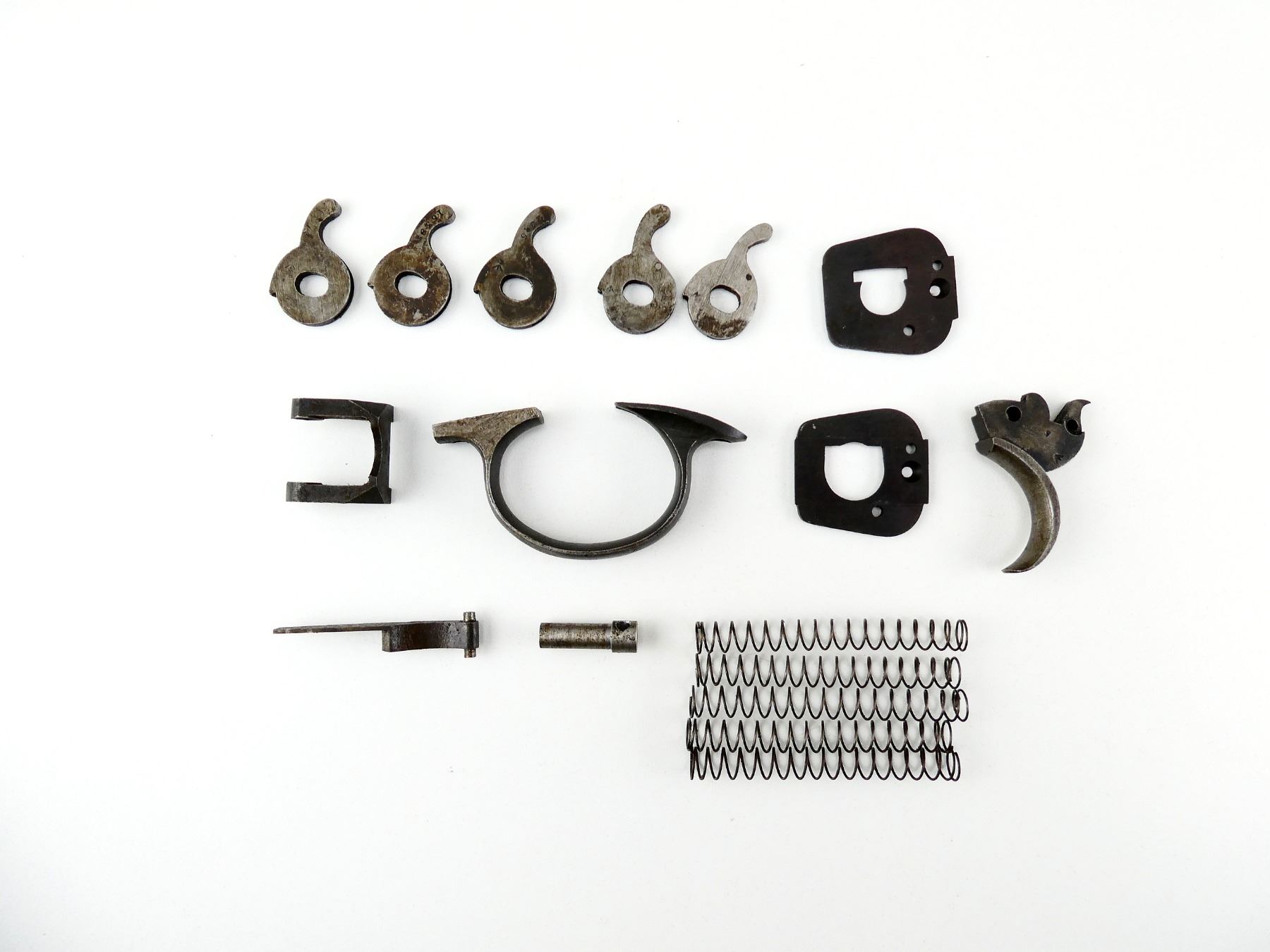 FITS .455 WEBLEY LARGE FRAME, LOT INCLUDES; TRIGGER, TRIGGER GUARD, (2) RECOIL PLATES, (5) EXTRACTOR LEVERS, HAND, ETC. MAY REQUIRE FITTING. SEE PHOTOS.