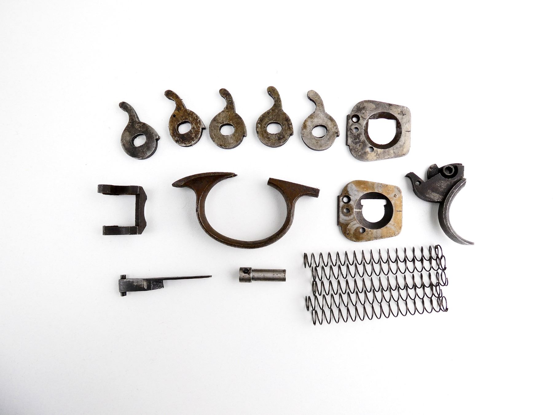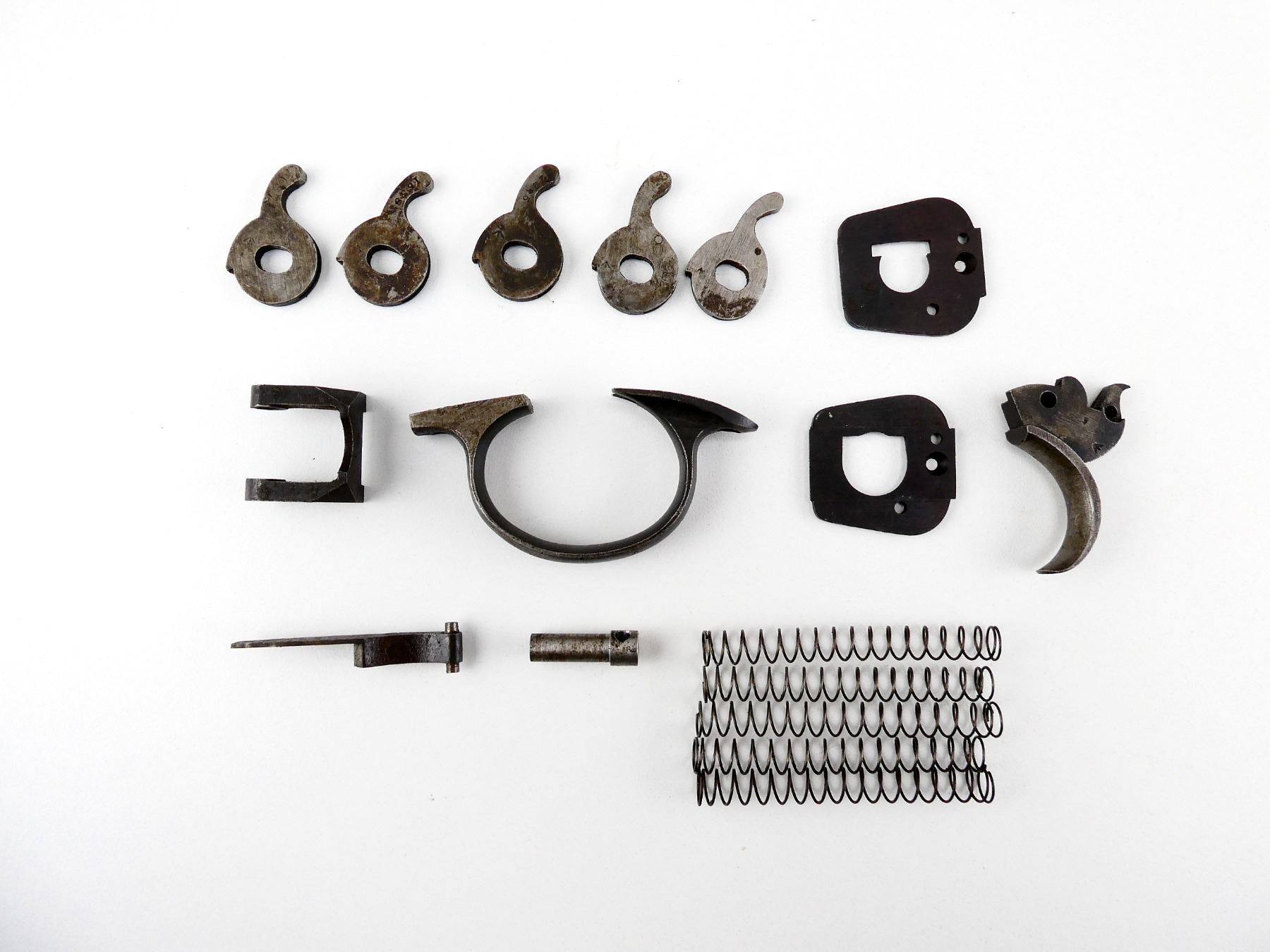 FITS .455 WEBLEY LARGE FRAME, LOT INCLUDES; TRIGGER, TRIGGER GUARD, (2) RECOIL PLATES, (5) EXTRACTOR LEVERS, HAND, ETC. MAY REQUIRE FITTING. SEE PHOTOS.