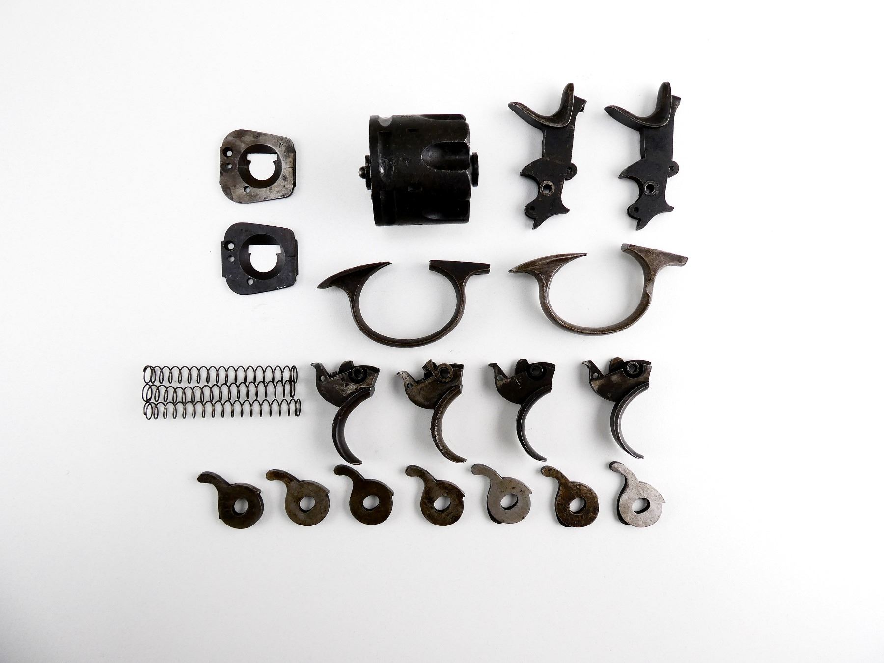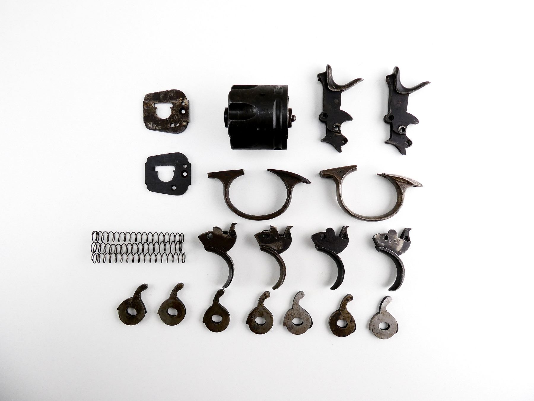 FITS .455 WEBLEY LARGE FRAME, LOT INCLUDES; (4) TRIGGERS, (2) TRIGGER GUARDS, HAMMER ASSEMBLY, (7) EXTRACTOR LEVERS, (3) EXTRACTOR SPRINGS, (2) RECOIL PLATES, CYLINDER WITH EXTRACTOR ONLY, (2) BROKEN HAMMERS, ETC. MAY REQUIRE FITTING. SEE PHOTOS.