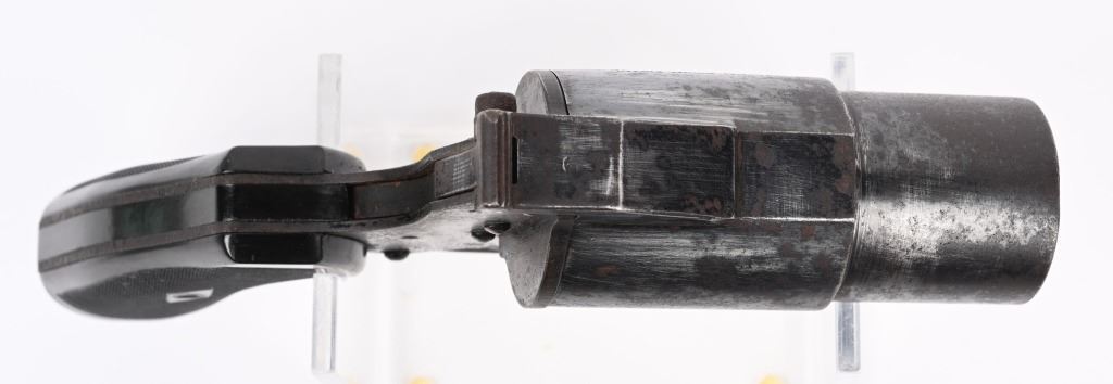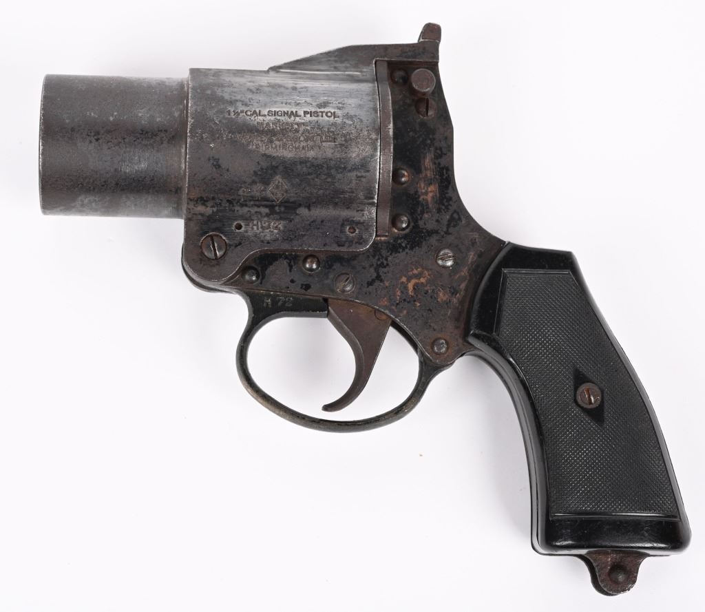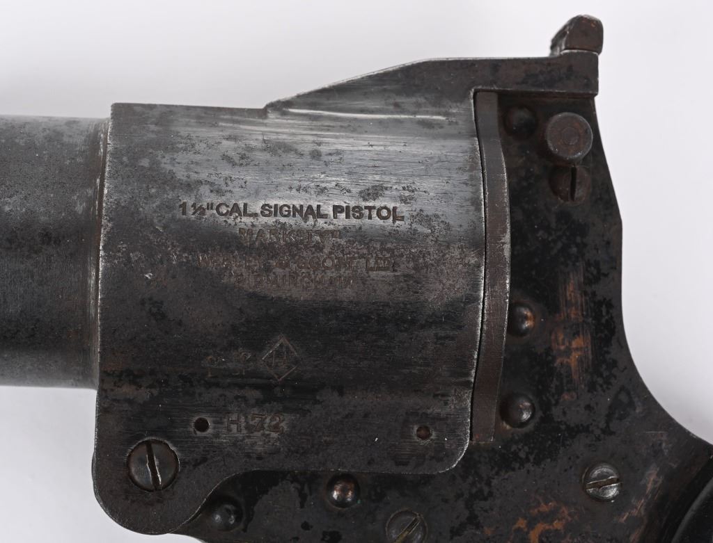 SERIAL NUMBER: H72. BARREL: 4". CALIBER: 1-1/2 CAL. MANUFACTURED: 1920's. Standard markings and features. Matching serials on the barrel and frame assembly. Black enamel finish. Checkered hard rubber grips. CONDITION: Metal is fair, with heavy finish loss and mild surface rust throughout. Grips have handling marks, scrapes and scratches. Bore is clean overall. Mechanically fine. NON FFL