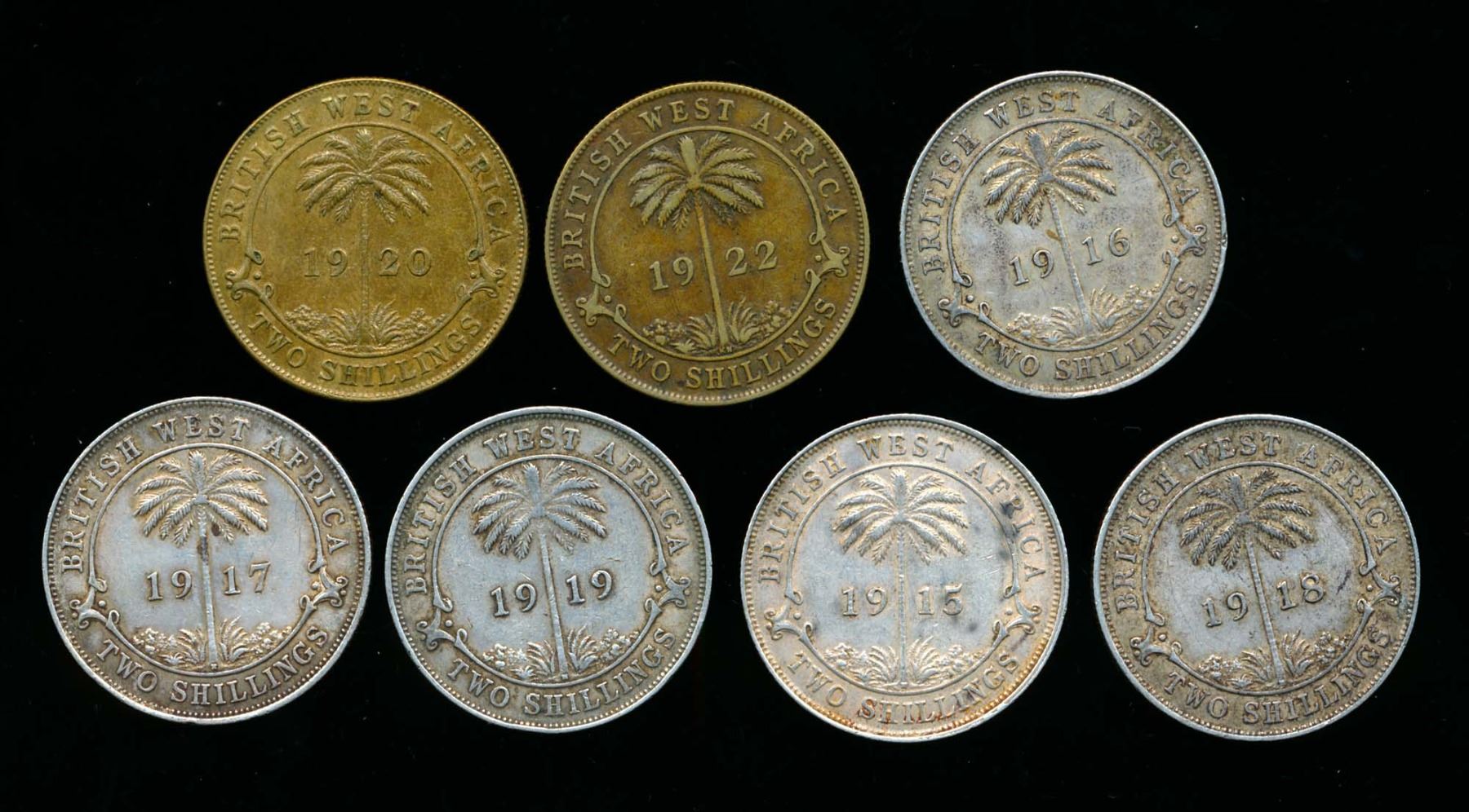 BRITISH WEST AFRICA Two Shillings 1913-1922. A 7 Piece Year Set, 56.6 gms Silver