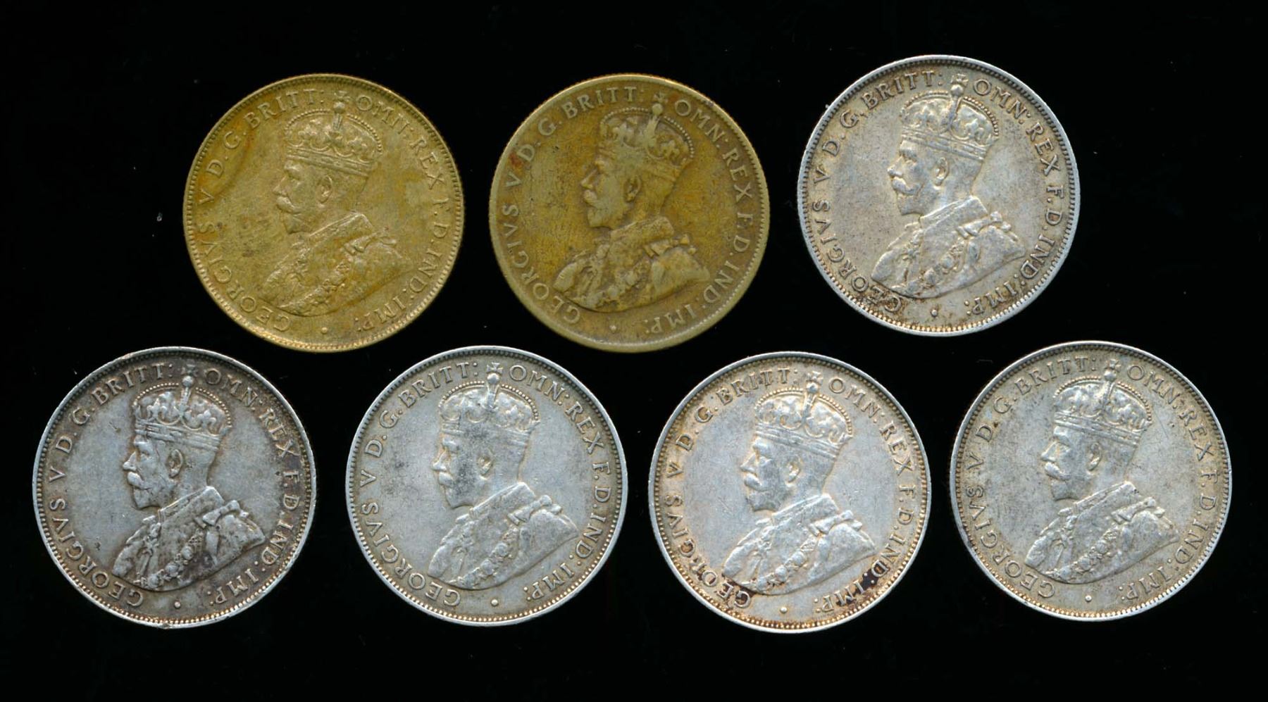 KM# 13 1 x 1915H VF, 1 x 1916H EF, 1 x 1917H VF, 1 x 1918H VF, 1 x 1919H F with KM# 13A 1 x 1920KN VF+ and 1 x 1922KN F.