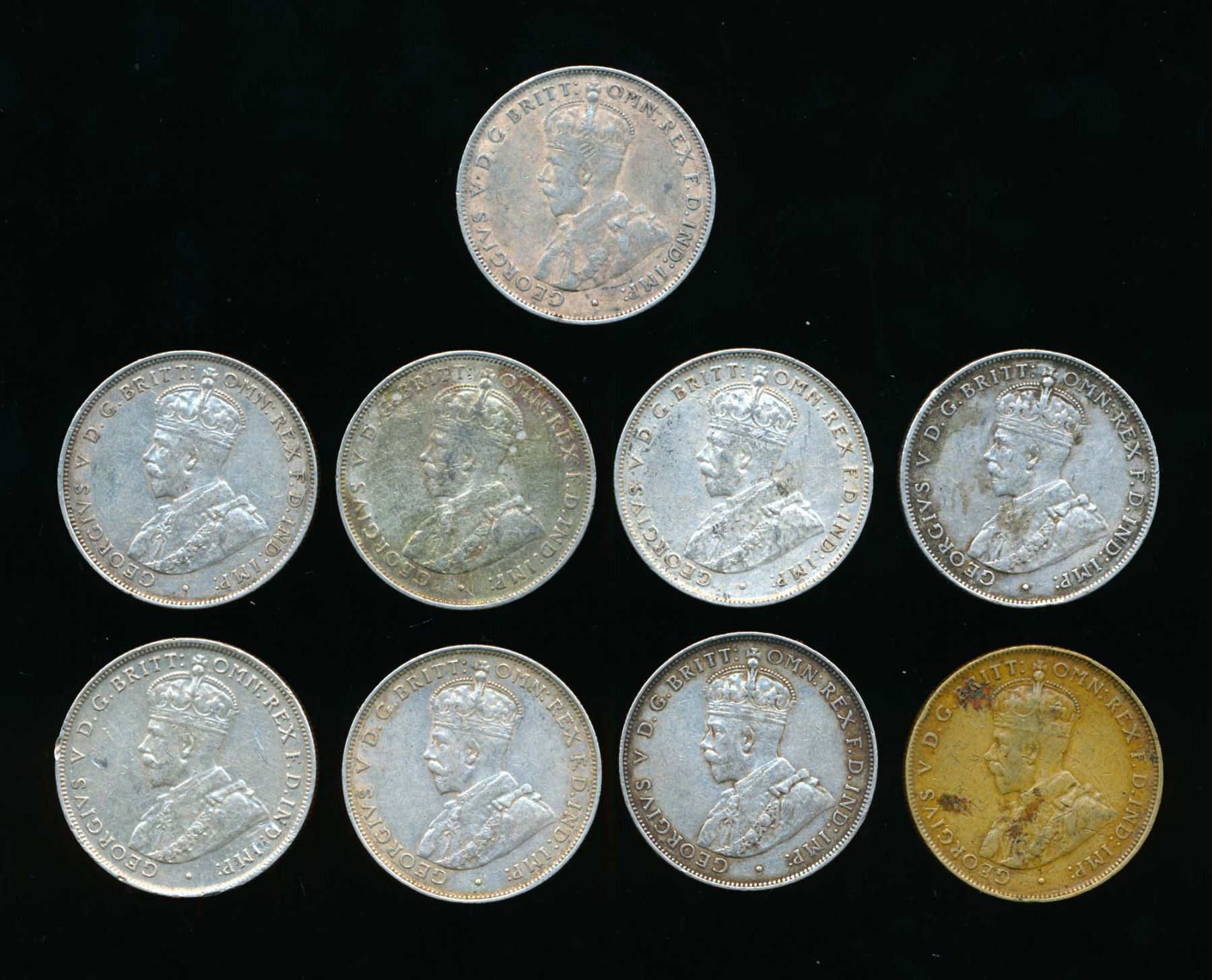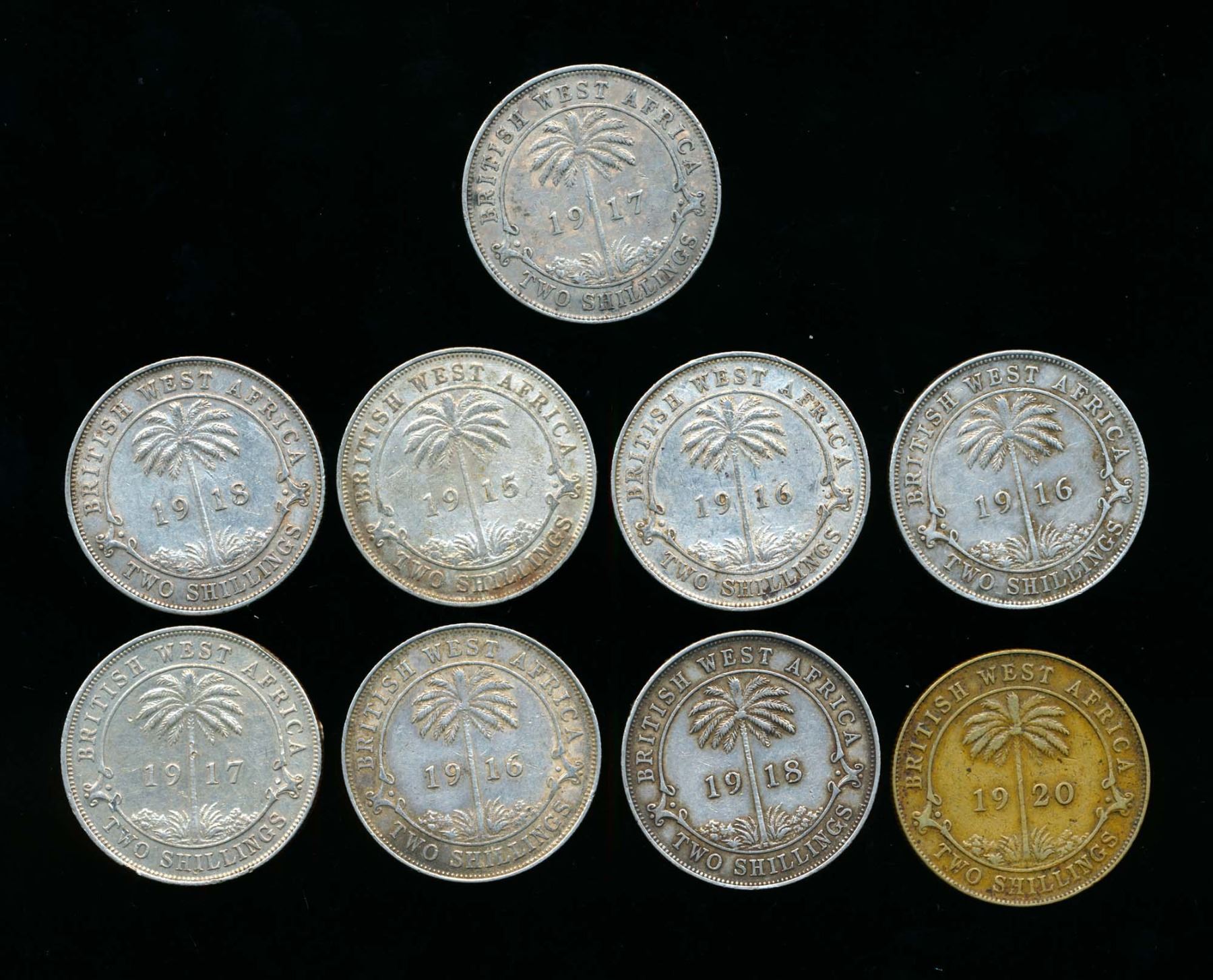 BRITISH WEST AFRICA Two Shillings 1915-1920. A 9 Piece Dealer Lot. 90.0 gms Silver