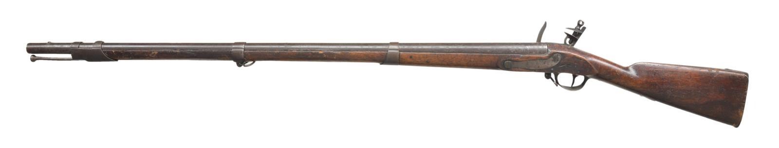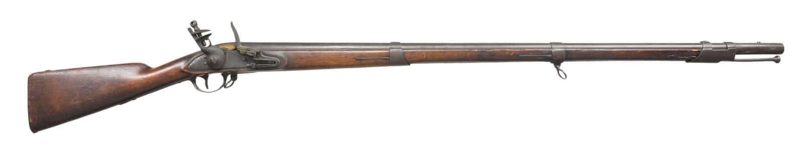 Cal. 74. NSN. Bbl. 38 1/2" w/ front stud, British proofs on top of breech section & bushed touch hole. Early 1800's style "WHATELY" marked lock. Musket walnut stock w/ 3 French style iron bbl. bands & iron furniture. Top of comb & in front of trigger guard is more recently stamped "T. O. WETHERELL". Tulip tip iron ramrod. CONDITION: bbl. has acquired a black patina showing light pitting & peppery oxidation throughout; heavy pitting around touch hole. Wood has good worn varnish w/ large cracks throughout, gouges & grain checks behind sideplate, & finish chips around buttplate. Front band spring has nail repair. Dark pitted bore. PROVENANCE STATEMENT: Estate collection of Thomas F. Wolfinger. (01-22174/MD). ANTIQUE. $300-500.