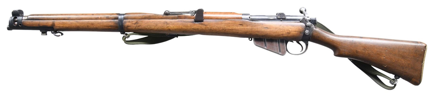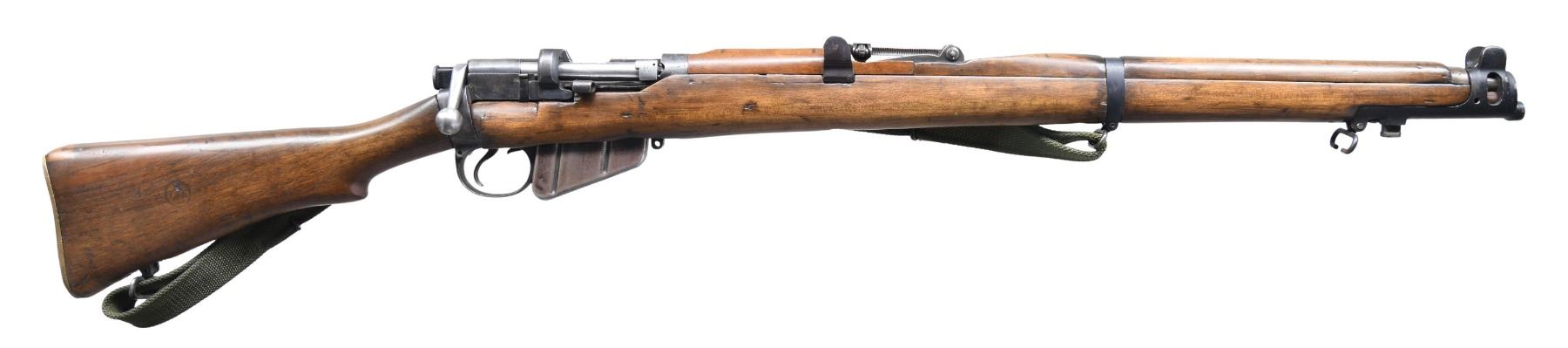ACTION MILITARY RIFLE. Cal.303 Brit. S# Z6401. Numbers match on bolt and receiver. Bbl. 25". Tangent rear sight graduated to 2000 yards. Blade front sight with solid protective ears. Receiver marked on right side of butt socket " CROWN GR/B.S.A. CO./191?/ SHTLE/ III.". Cutoff is present. Bayonet lug and stacking swivel are present. Nosecap retaining screw is not present. Hardwood stock set. Buttstock has a circular "TE" marking on the right side. Brass trap buttplate. Forend has been by the removal of an app. 1" X2" area above trigger guard. Green web sling. MAGS: 1-10rd. detachable. CONDITION: stock set has an arsenal rework finish over moderate wear and handling marks Buttstock has small arsenal repairs at toe and heel. Metal has small areas of worn original finish and is turning grey. Bolt finish has been removed. Fair worn bore with frosted grooves. (25-992/RW). CURIO. $ 300-500.