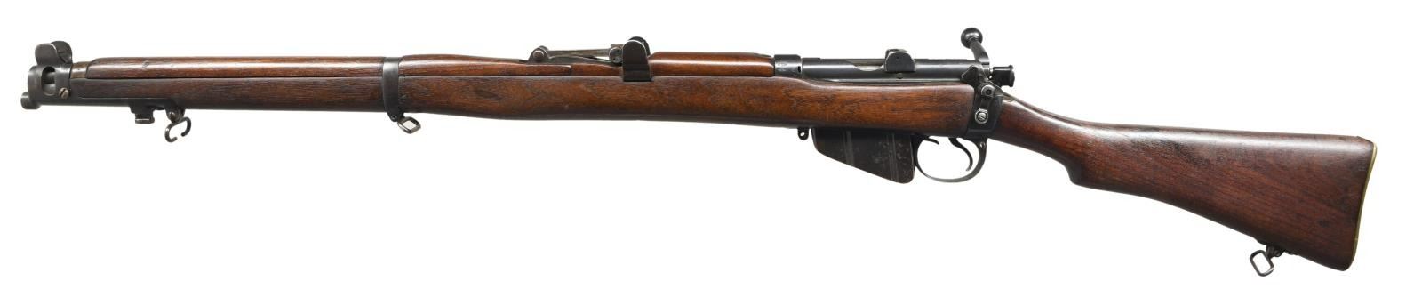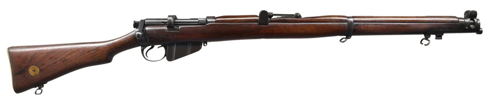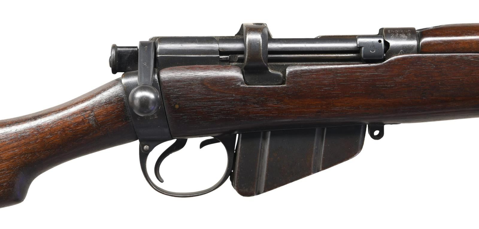 ACTION MILITARY RIFLE. Cal. 303 Brit. S# 2958M. Numbers match on receiver, rear sight & nose cap. 25" bbl. Tangent rear sight graduated to 2,000 yards w/ windage adjustment. Blade front sight. Nose cap has protective ears, bayonet lug & stacking swivel. Receiver is marked on right side "ENGLAND" which is an early (1950s) import mark. Receiver is marked on right side of butt socket "crown GR" / "B.S.A. CO" / "1917" / "SHT.L.E." / "III*". Bbl. is marked behind rear sight "HV" & "SC". Walnut stock set w/ brass trap buttplate. Stock has blank brass marking disk on right side. MAGS: 1 unmarked detachable 10 rd. CONDITION: stock has arsenal rework finish w/ softening of edges & loss of wood in inletted areas while still retaining a pleasing appearance w/ scattered handling marks. Metal retains 70% original blue finish w/ thinning wear & spots of light oxidation. Fair bore turning dark w/ worn lands. (23-2230/RW). CURIO. $300-500.