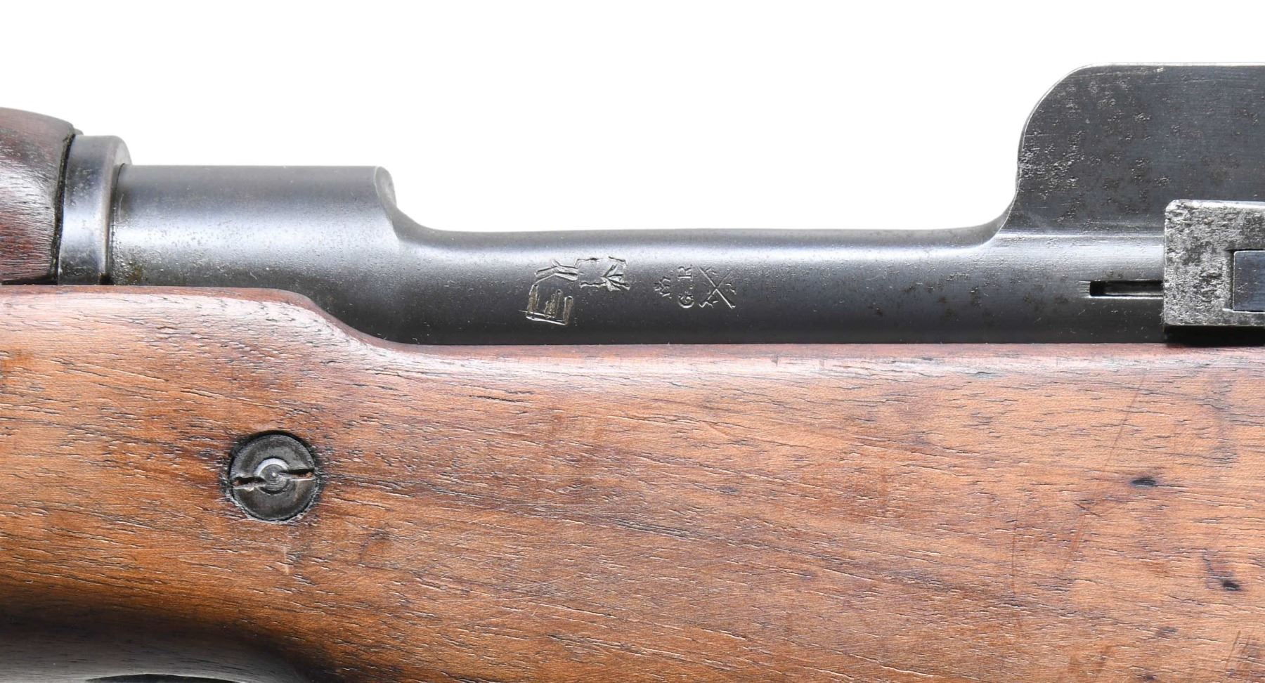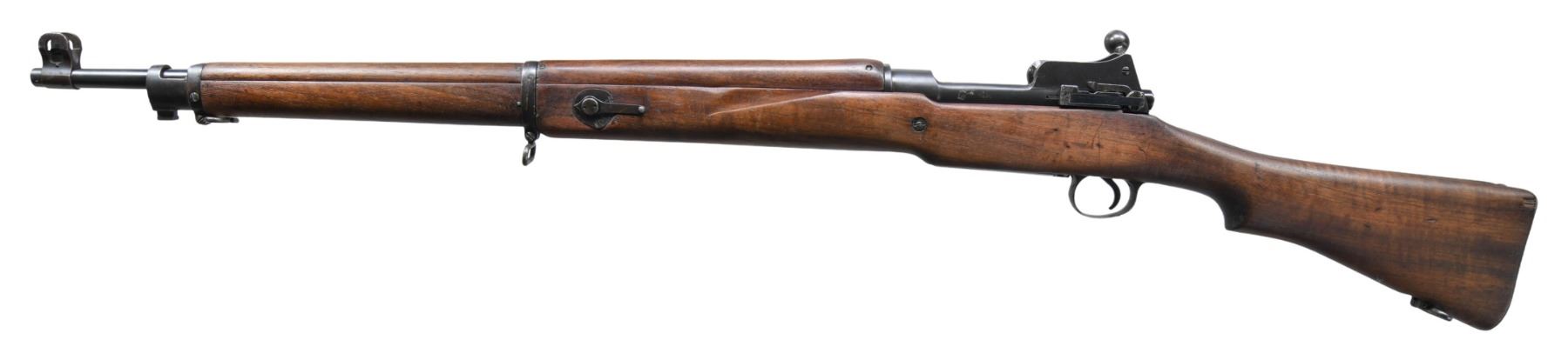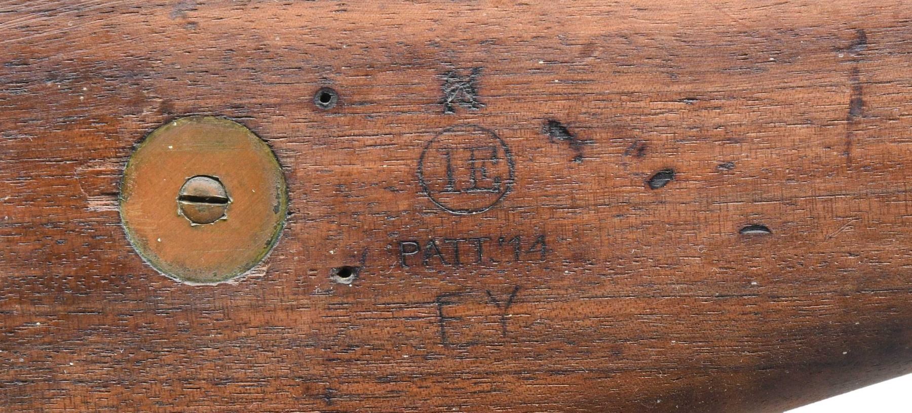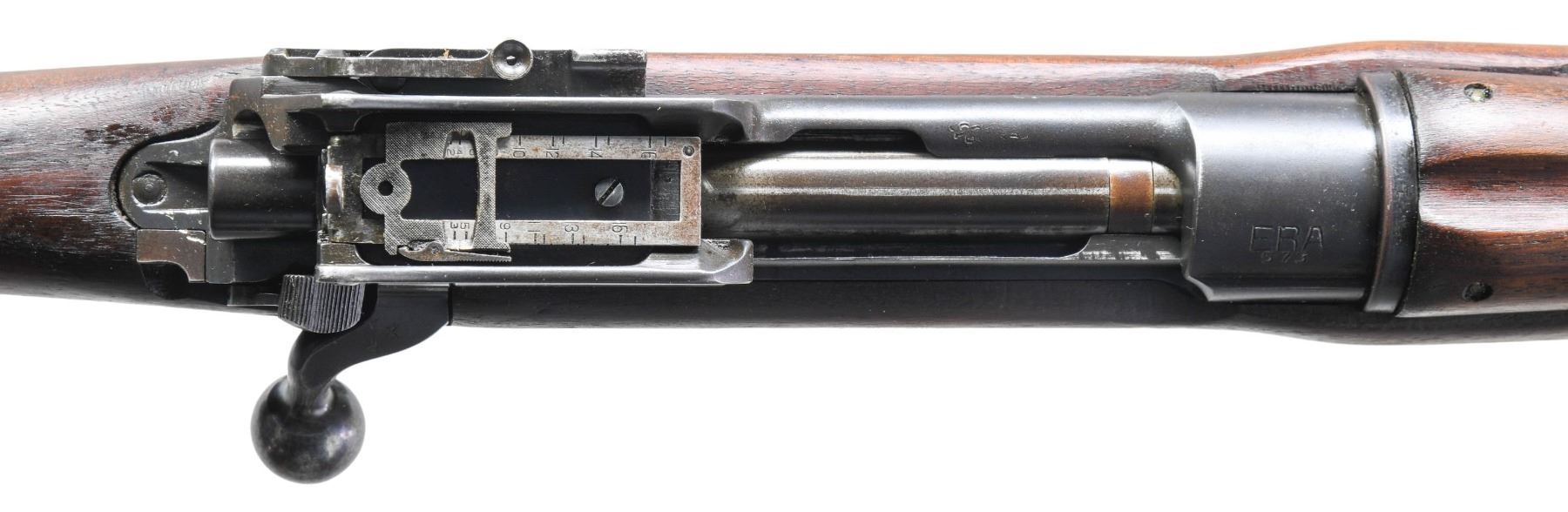 MILITARY RIFLE. Cal. 303 British. S# 573. Bbl. 26". Ladder rear sight graduated to 1,650 yards. Blade front sight w/ protective ears. Bolt is marked underneath w/ "E 6921". All visible parts markings are "E". Matching serial number on rear sight ladder. Volley sight is present & functional. Receiver has the early "ERA" marking indicating Eddystone Remington Arms. Left receiver rail has acceptance & view marks plus partial "EY" which also appears on the buttstock & means the rifle is approved for emergency use only. Walnut stock set. Stock has faint view mark under pistol grip & is marked on the right side of the stock w/ a broad arrow over an encircled "IE" indicating Eddystone manufacture. Also marked "PATT.' 14 / EY". Brass stock disc is unmarked. CONDITION: stock set has very good lightly cleaned appearance w/ generally legible markings. Stock has light wear & small scattered handling marks. Two small cracks behind receiver tang & one small missing chip at right rear of buttstock. Metal retains 75% of its original thinning blue w/ scattered spots of light oxidation & missing finish. Bore has frosted appearance w/ dark grooves leaving strong rifling. (25-2785/RW). CURIO. $400-600.
