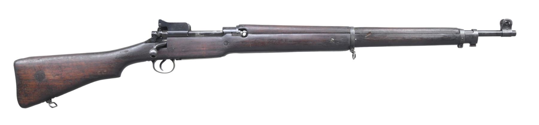 MILITARY DRILL PURPOSE RIFLE. Cal. 303 British. S# 35195. Numbers match on bolt, receiver & rear sight ladder. Bbl. 26". Rifle was converted to drill purpose by the addition of a transverse cross-pin through the chamber. Cross-pin has been removed & the bbl. shoulder at the receiver ring has been lathe-turned likely for the purpose of removing the bbl. from the rifle. The bolt marked "DP" on the handle appears to be fully functional. Rifle should be considered unsafe. Receiver ring is marked on top "DP". Walnut stock set. Marking disc hole has been plugged on right side of butt. Butt is marked "DP". Volley sights have been removed. Sight base is present on left side of forend. CONDITION: stock set has well-worn original finish w/ staining & numerous handling marks. Metal retains 60% of its original finish w/ wear & scattered small handling marks. Bore is worn, but shiny. (25-2855/RW). CURIO. $100-200.