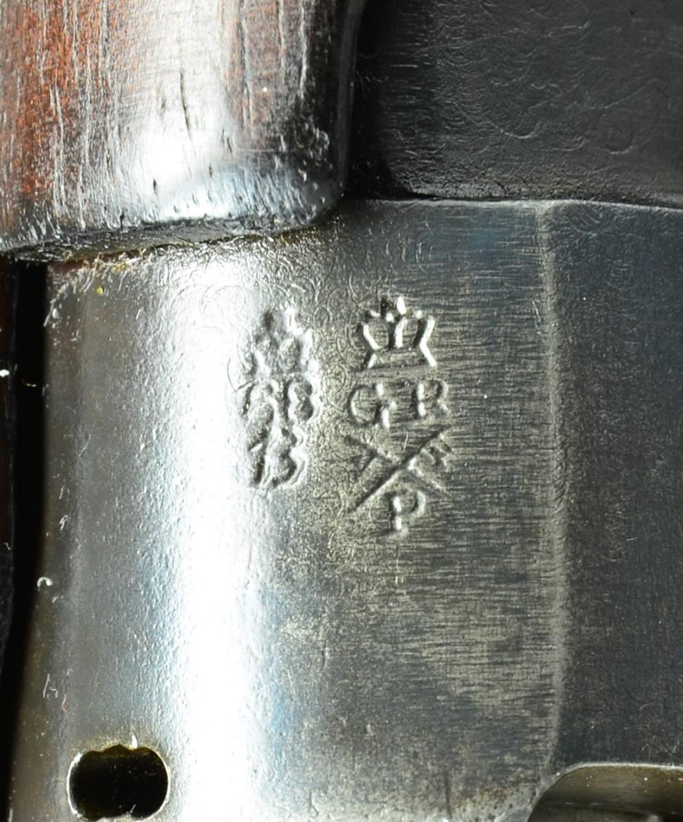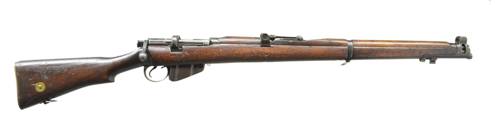 MKI NO. III LEE ENFIELD BOLT ACTION MILITARY RIFLE. Cal. 303 Brit. S# C49953. Bbl. 25". Numbers match on receiver, bolt, forend & bayonet lug. Standard Small Arms Co. of Birmingham was taken over by the British government & became National Rifle Factory No. 1 in 1918 & mfg. rifles as part of the pedaled scheme rifle production. Butt socket is marked on right side w/ crown "GR" "1918" "SHT L.E." "star". Receiver is also marked behind safety w/ "SSA" "P" "42". Receiver ring marked w/ British proofs. Trigger guard is marked "S.S.A" at forward end. Tangent rear sight graduated to 2,000 yards. Bbl. is marked "HV" under sight. Blade front sight. Nose cap has protective ears & bayonet mt. Buttstock, forend & rear handguard are walnut. Front handguard is hardwood. Brass trap buttplate. Buttstock has brass disk on right side. Disk is marked "D/P" "PCL" indicating rifle to be issued for drill purpose. MAGS: 1 detachable 10 rd. CONDITION: stock set has original finish w/ moderate wear, scratches & handling marks throughout. Metal has early arsenal rework finish turning gray & patina. Bore is shiny but w/ heavily worn lands. (22-598/RW). CURIO. $300-500.