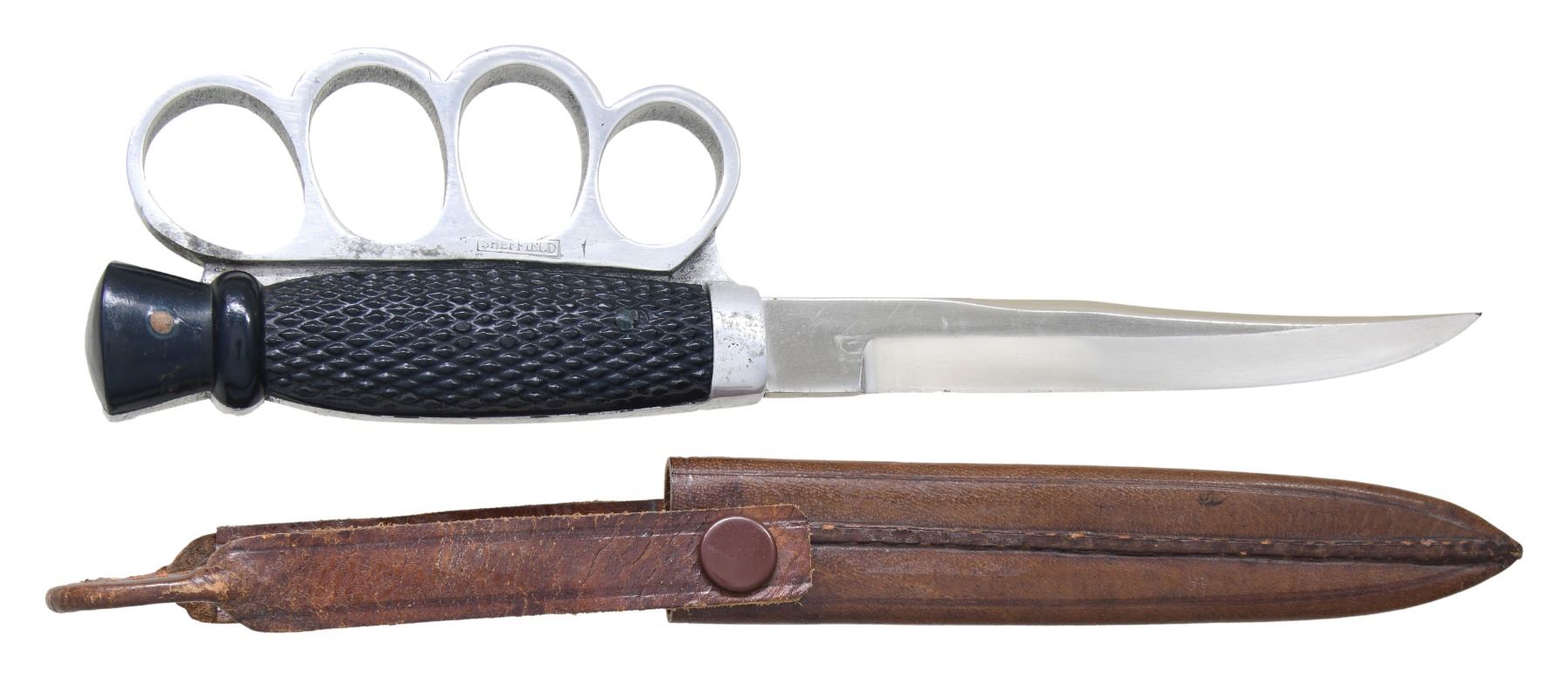 WITH SHEATH. British WWI / WWII Officer knuckle knife mfg. in Sheffield, with this exact style knife pictured in "Knives of the United States Military World War II" by Michael W. Silvey. Blade is unmarked, with the knuckle duster being stamped with a boxed "SHEFFIELD". The upswept blade measures 5" from the point to the bottom of the ricasso, with an overall length of 9 1/4". Aluminum handle, with 2-piece checkered black plastic scales and integral aluminum knuckle duster. UNATTACHED ACCESSORIES: unmarked brown leather sheath. CONDITION: blade retains the majority of its polished finish, exhibiting some superficial handling marks overall, with a small spot of flaking present at the point on the right side. Grip scales are good, showing smoothing and some superficial handling marks. Sheath remains malleable, exhibiting some spots of age related cracking and minor crazing, primarily on the retention strap. (02-24406/MLW). $600-1,000.