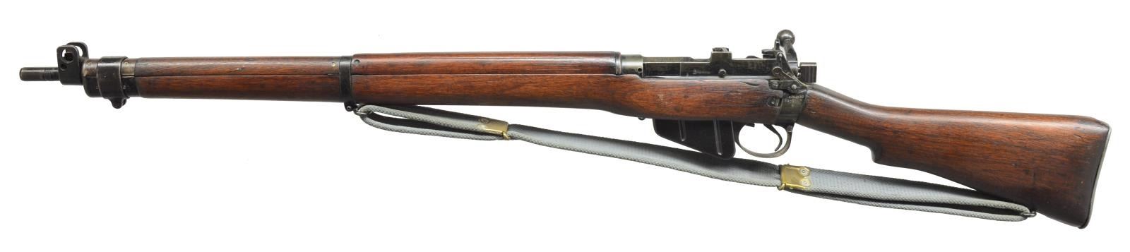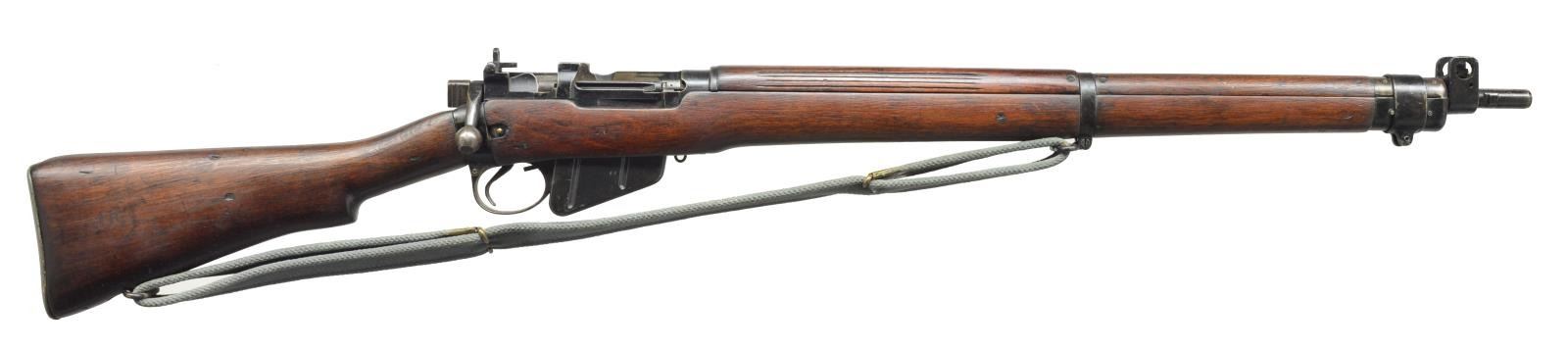 Cal. 303 Brit. S# 79C2067B. Bbl. 25". Numbers match on receiver & bolt. Rifle marked on left side of receiver "S No.4 MK1*" & sm. "Ordnance bomb". Marked on top left receiver rail "US PROPERTY". Rifle mfg. in US by Savage/Stevens & marked "US PROPERTY" in order to meet "Lend Lease" requirements. Butt socket marked on left side "England" export marking. Flip type aperture rear sight. Blade front sight w/ protective ears. Muzzle marked on top w/ British export proofs. Gray web sling. Matching walnut stock set w/ grooved rear handguard & cast metal trap buttplate. Butt contains pull through cleaner. MAGS: 1 non-matching 10 rd. CONDITION: stock set has light wear w/ scattered dents & scratches over arsenal reword finish. Metal has 60% original finish w/ wear & flaking. Poor worn dark bore. (20-3007/RW). CURIO. $500-700.