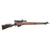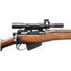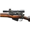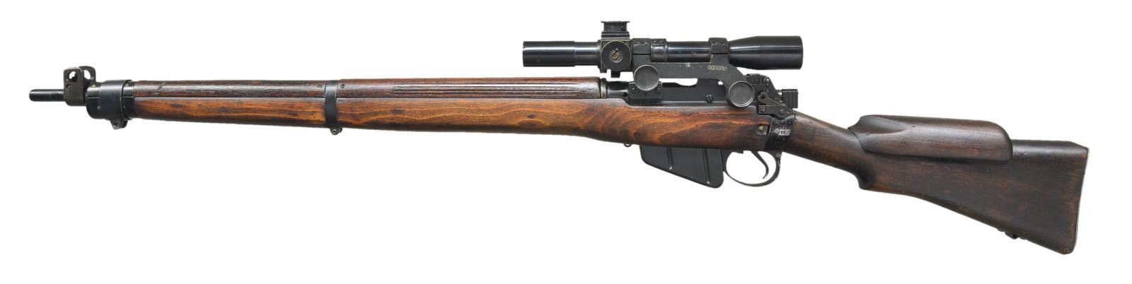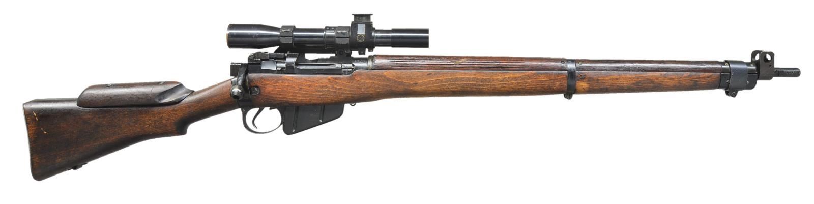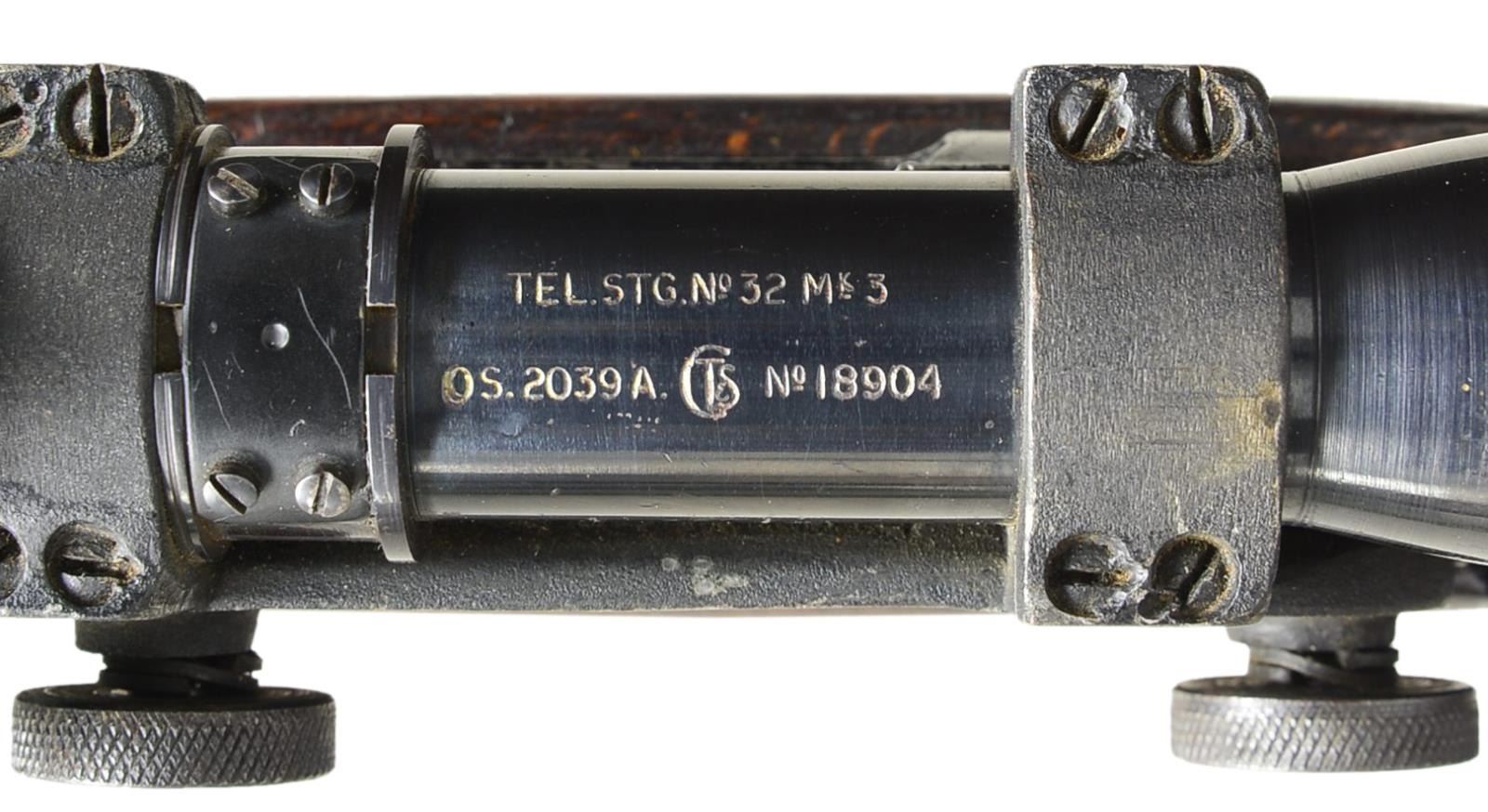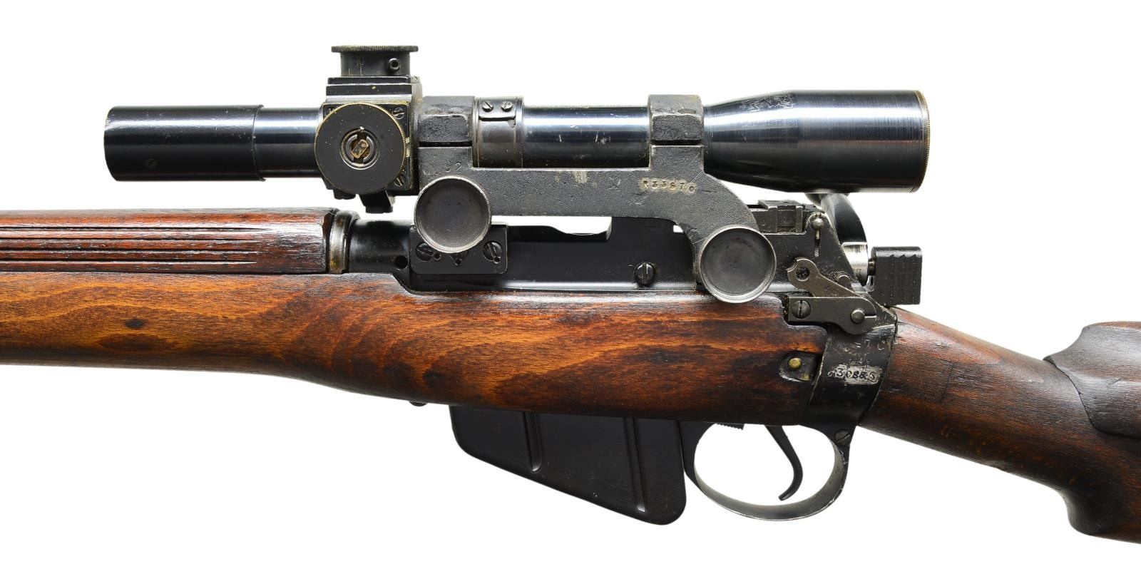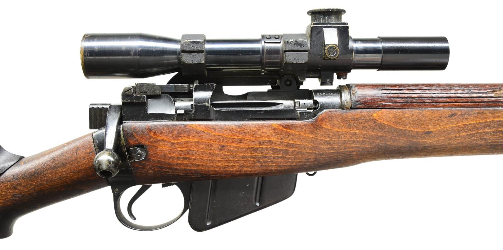 RIFLE. Cal. 303 Brit. S# A30886 matches on receiver & bolt. Bbl. 25". Scarce WWII sniping rifle mfg. by Birmingham Small Arms Co. The combination of the #4 rifle & #32 telescopic sight was adopted early in WWII. Specially selected rifles were given a wooden cheekpiece & the battle aperture was removed from the rear sight to clear the scope. Receiver marked on left side "NO. 4 MK 1 T". Left side of butt socket in body M47C indicating mfg. by BSA Shirley dated 1944. TR indicating rifle was selected for sniper conversion. Receiver ring has England export mark on right side & export proofs on right side of bbl. Rifle has adj. rear sight graduated to 1,300 yards. Blade front sight w/ protective ears. Rifle has been fitted w/ #32 telescope sight. Scope marked on top "Tel.Spg.No 32 MK3 BS. 2039A. CTS" logo & "No 18904". Mount numbered on left side over forward attaching knob "?92". S# appears R33870. Scope rings have matching number right side. Scope has S sharp post reticle w/ horizontal cross wire. Windage & elevation knobs move freely. Hardwood stock set. Buttstock has been renumbered at top of grip to 18904. Hardwood cheekpiece attached w/ blued steel screws. White metal trap buttplate. Sling swivel bows are not present. MAGS: 1-10 rd. detachable. CONDITION: stock set has light wear, scratches & handling marks over arsenal rework finish. Metal retains 80% over original black finish w/ light wear & scratches blued steel scope tool has large percentage of original finish w/ scattered spots of fine oxidation & light wear. Optics appear slightly cloudy w/ several dark spots. Dark bore w/ strong lands. (21-2465/RW). CURIO. $2,500-3,500.