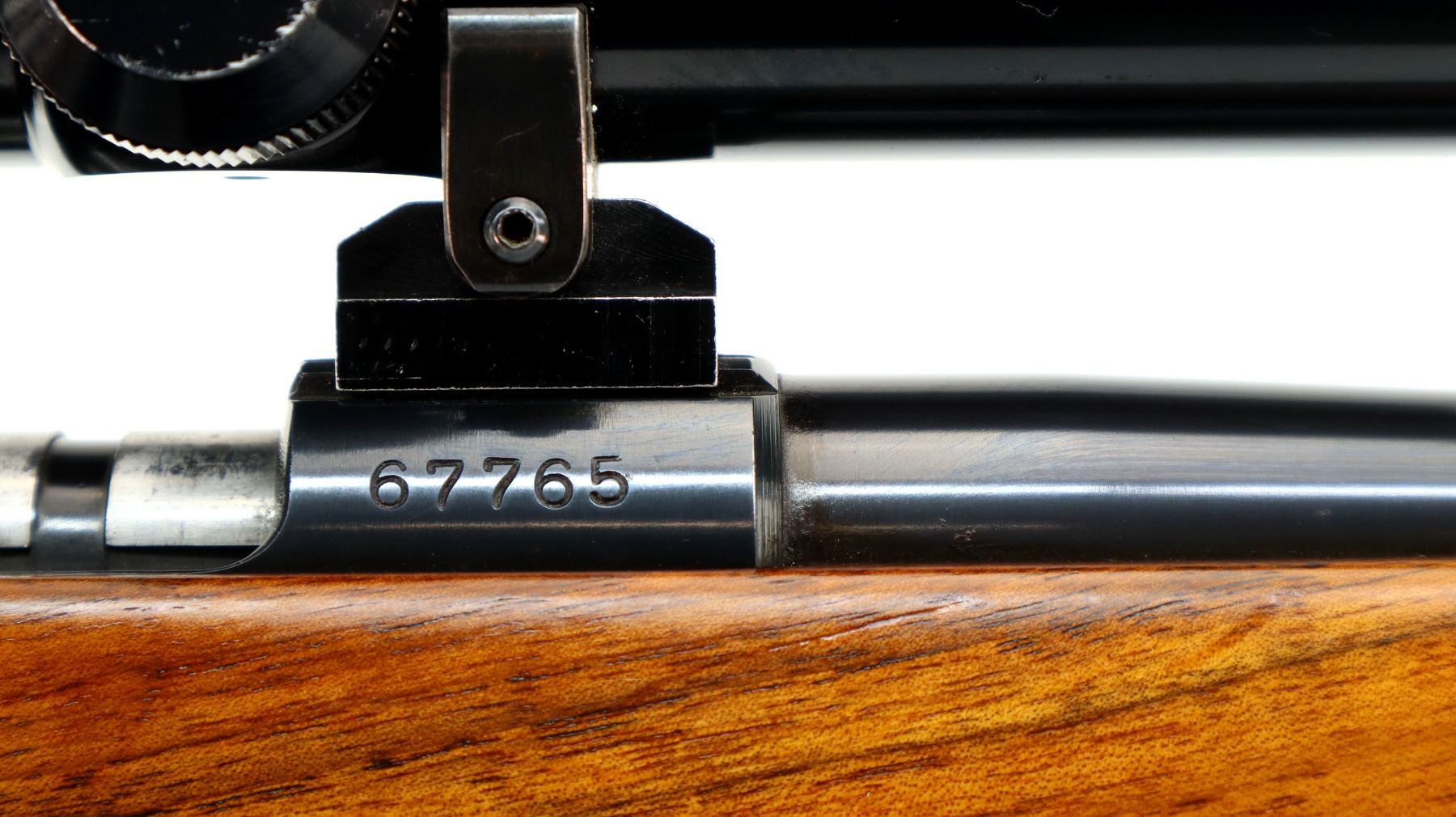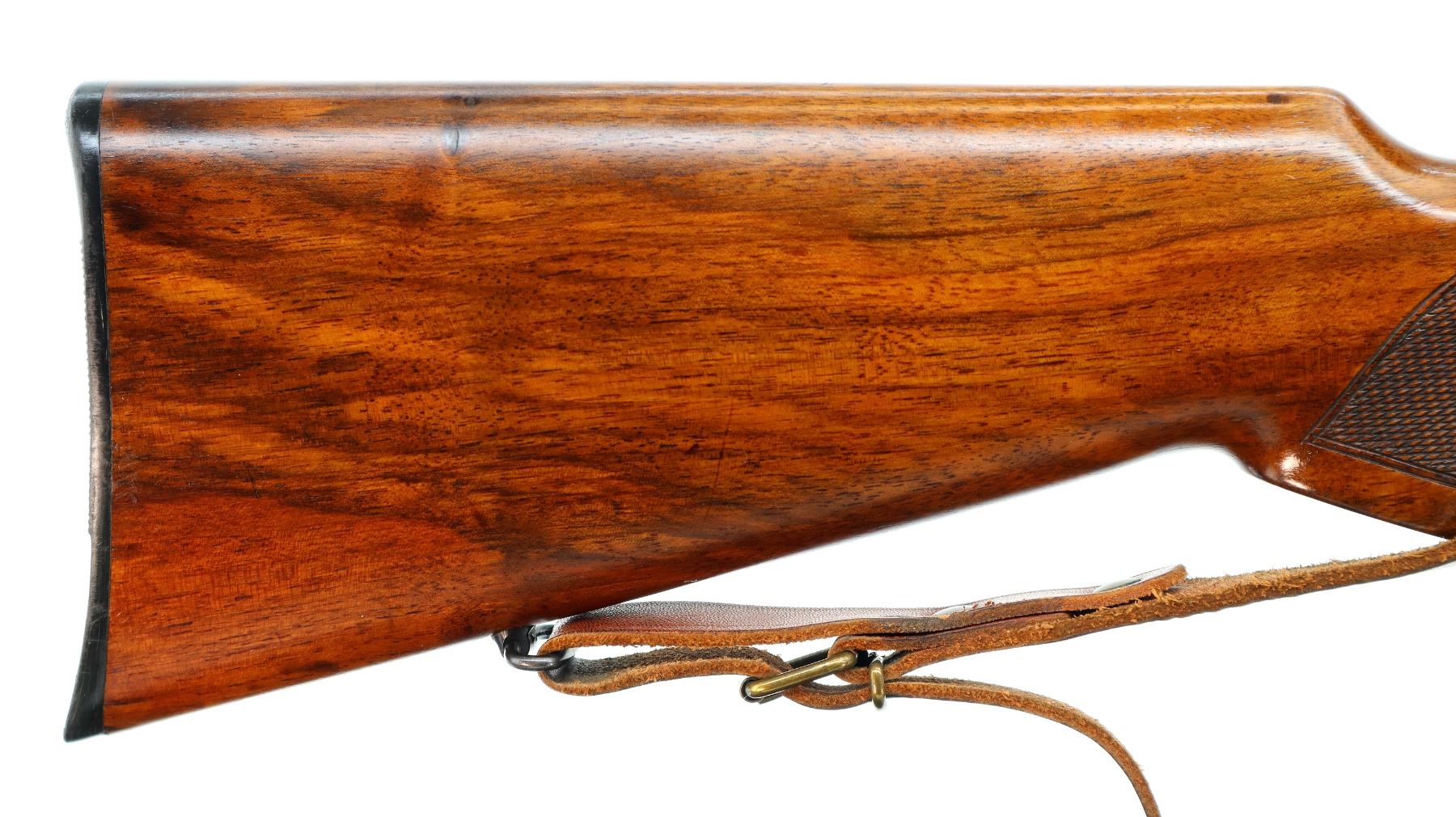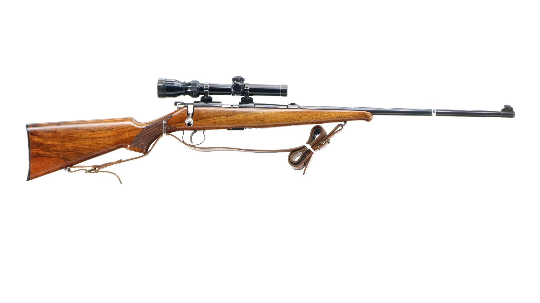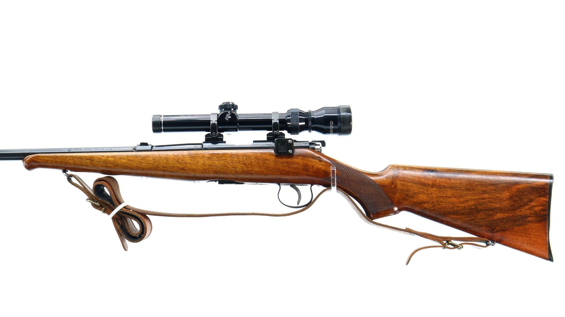 Main Description: Dated 1950. Blade front sight with ramp, missing rear sight, dovetail blank installed, polish blued finish, receiver has integral scope bases with Tasco 1.75-5x20 scope installed, clear optics with duplex crosshair. Smooth bolt knob, peep sight base on left side of receiver. One piece wood stock, Schnabel forend tip, checkered pistol grip, grooved black polymer butt plate, sling swivels with brown leather sling. Parts include: Lyman Globe front sight with 10 inserts, adjustable Redfield peep sight with various eye cups and spare parts, rubber eye cup and Watson pin front sight with hood.