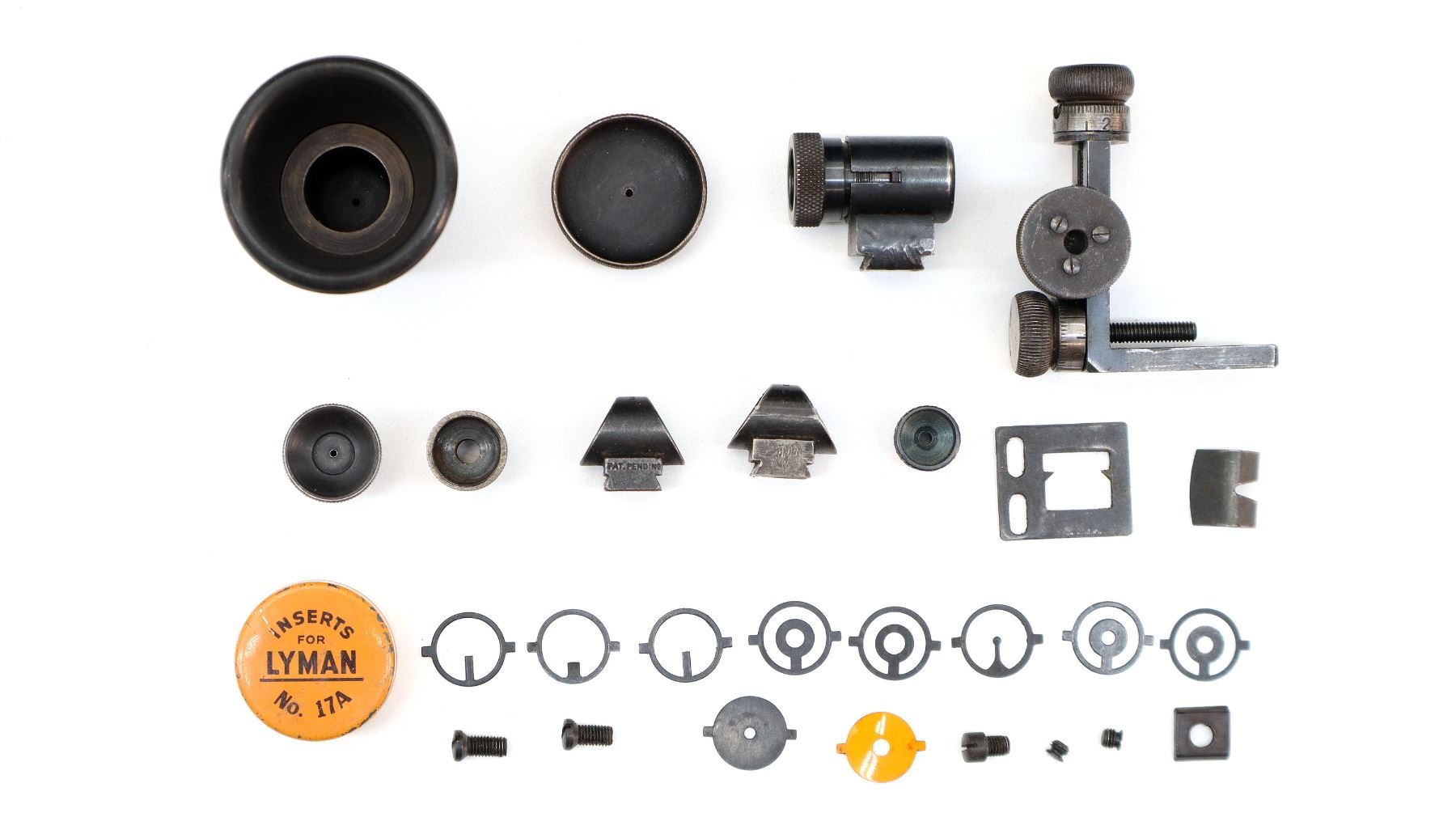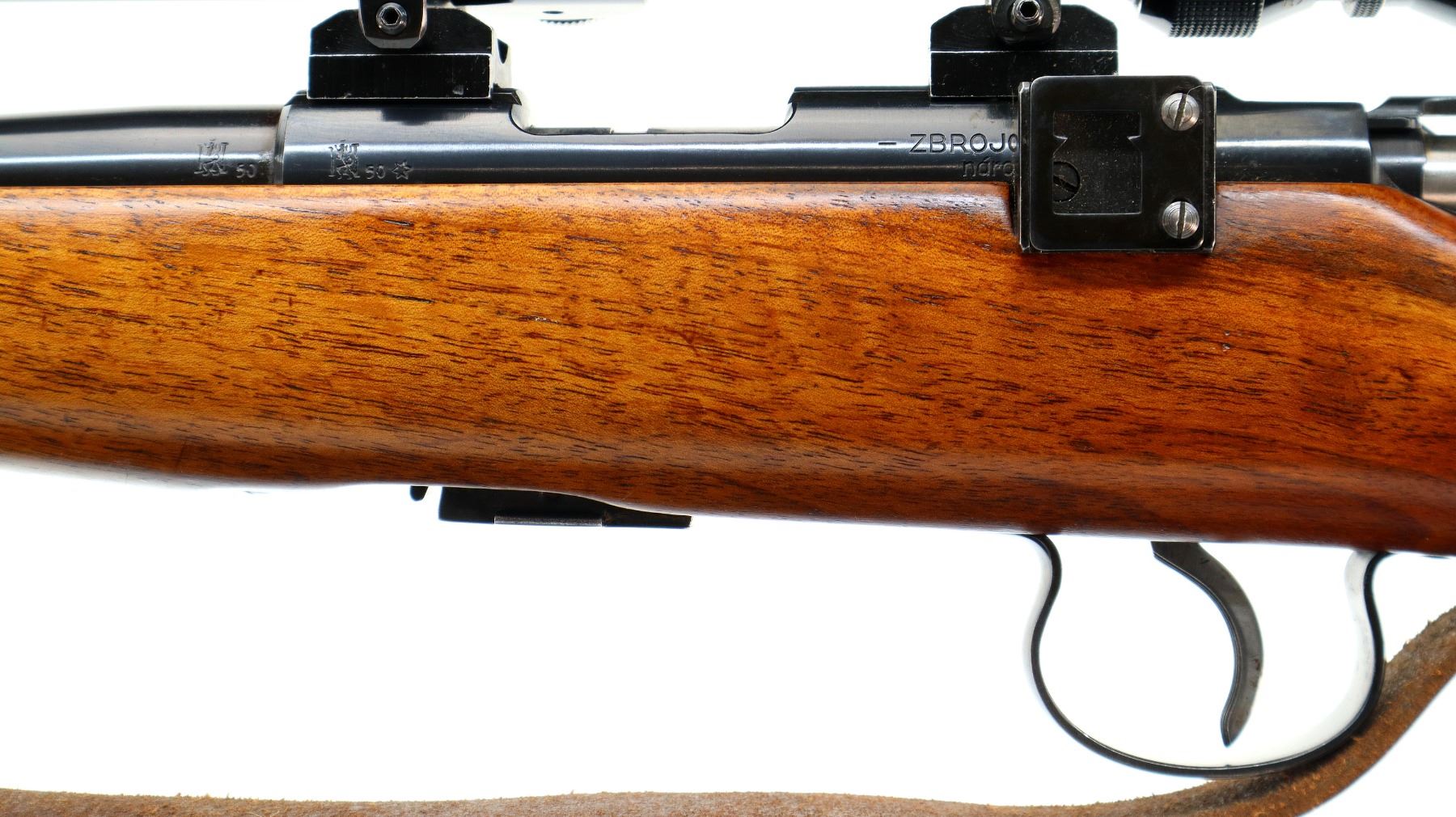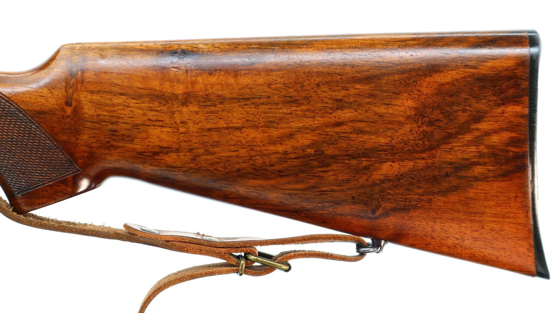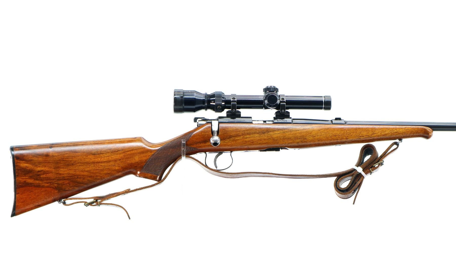 Main Description: Dated 1950. Blade front sight with ramp, missing rear sight, dovetail blank installed, polish blued finish, receiver has integral scope bases with Tasco 1.75-5x20 scope installed, clear optics with duplex crosshair. Smooth bolt knob, peep sight base on left side of receiver. One piece wood stock, Schnabel forend tip, checkered pistol grip, grooved black polymer butt plate, sling swivels with brown leather sling. Parts include: Lyman Globe front sight with 10 inserts, adjustable Redfield peep sight with various eye cups and spare parts, rubber eye cup and Watson pin front sight with hood.