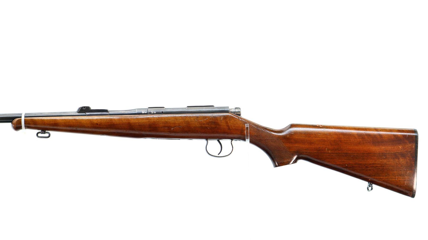 Main Description: Blade front sight with ramp, missing rear sight base is present, blued finish, grooved receiver, missing bolt handle, safety and parts, action screws and possibly other small pieces. Threaded muzzle with no cap. One piece wood stock, Schnabel forend tip, checkered pistol grip and black polymer butt plate, stock chipped at toe and sling swivels.