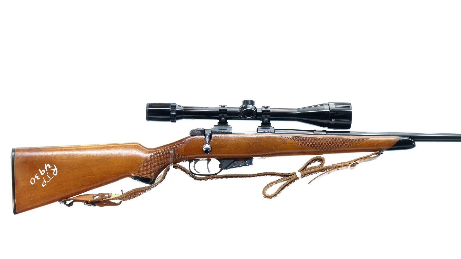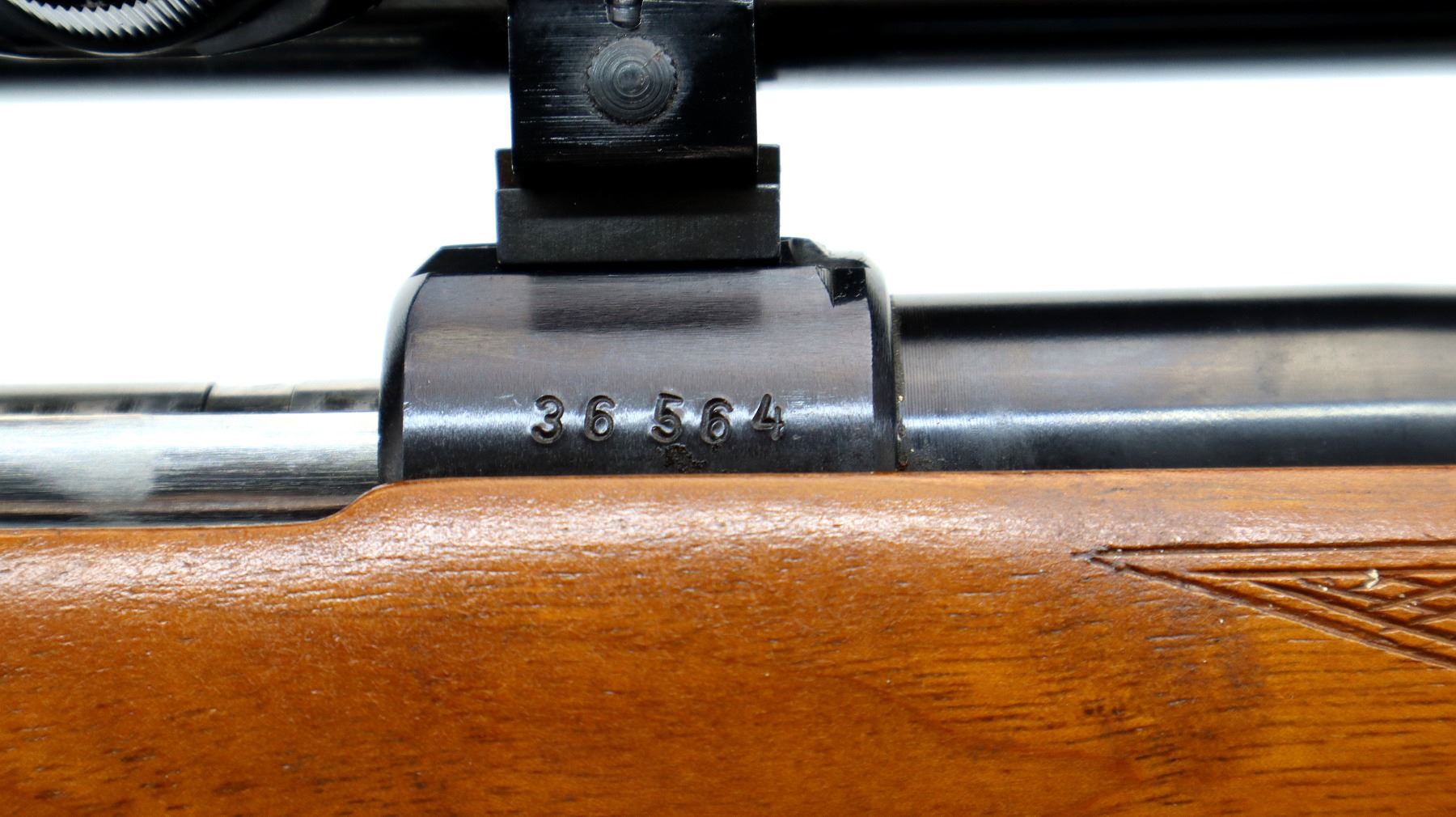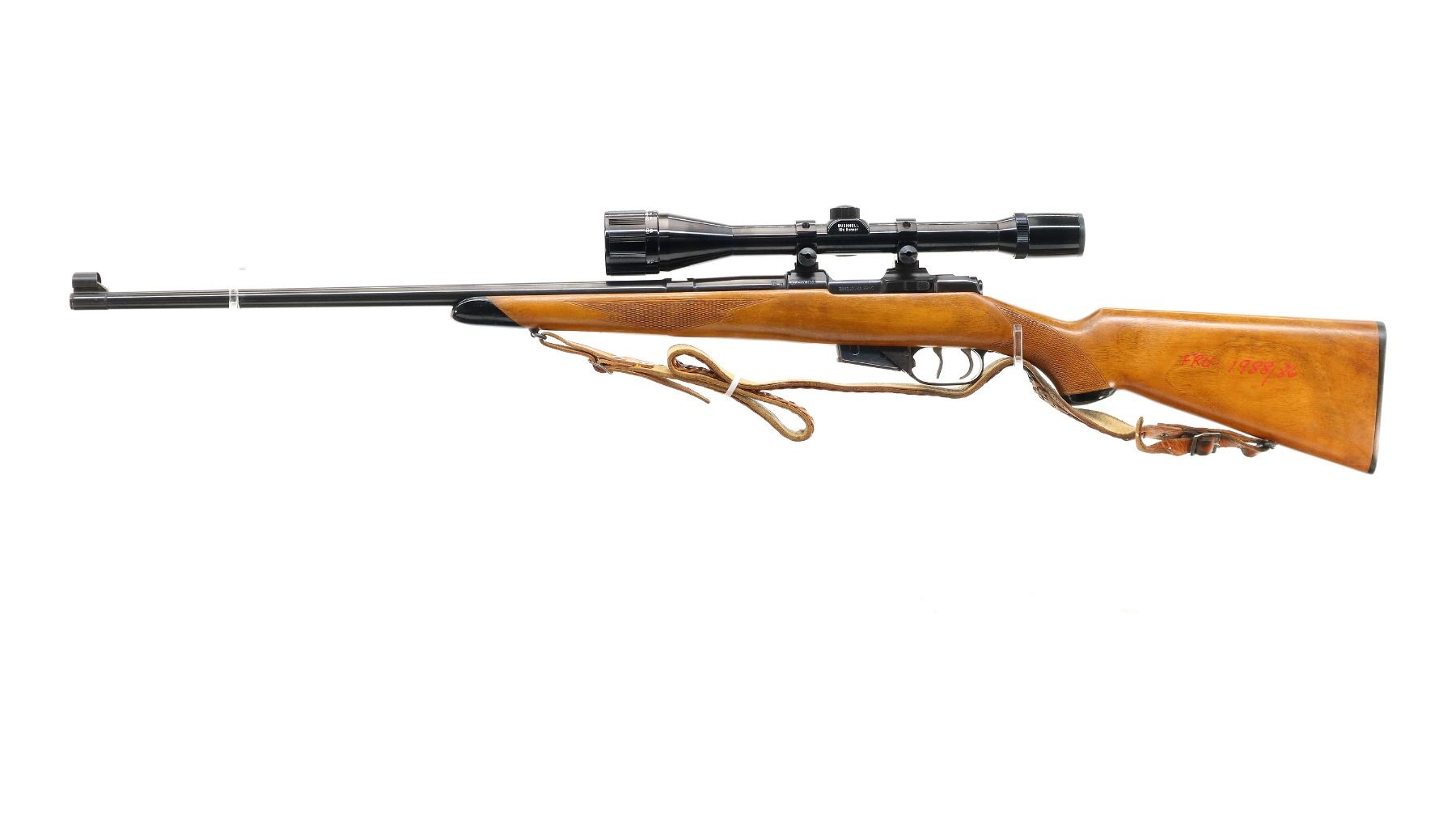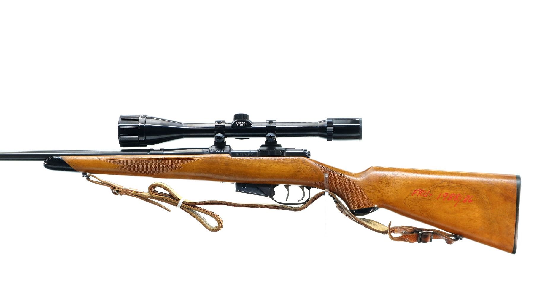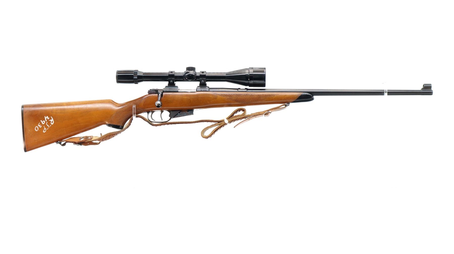 Main Description: Blade front sight with hood and ramp, missing rear sight dovetail present, blued finish, receiver has integral scope bases with Bushnell 10X Banner AO Scope installed, clear optics with duplex crosshair. Smooth bolt knob. One piece wood stock, black painted forend and pistol grip caps, checkered forearm, pistol grip and black polymer butt plate. Letters/Numbers painted in red on left side of stock, white paint on right side of stock. Double set triggers, sling swivels with brown leather sling.