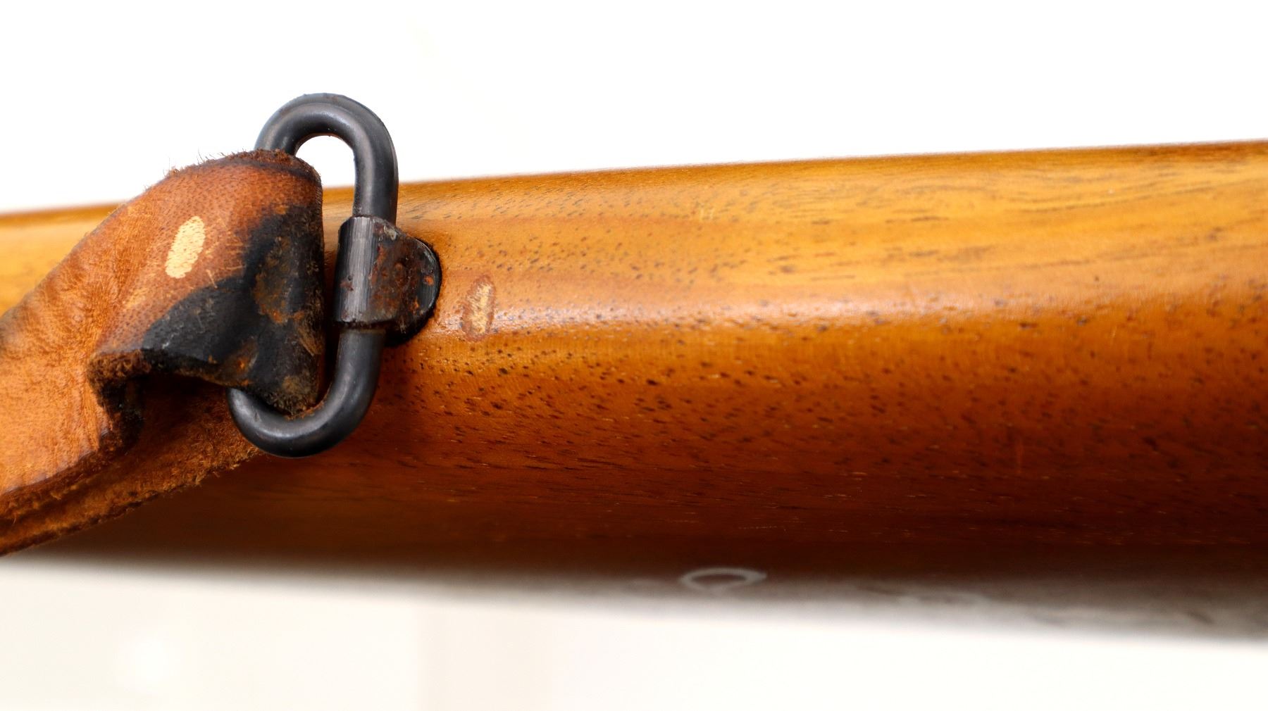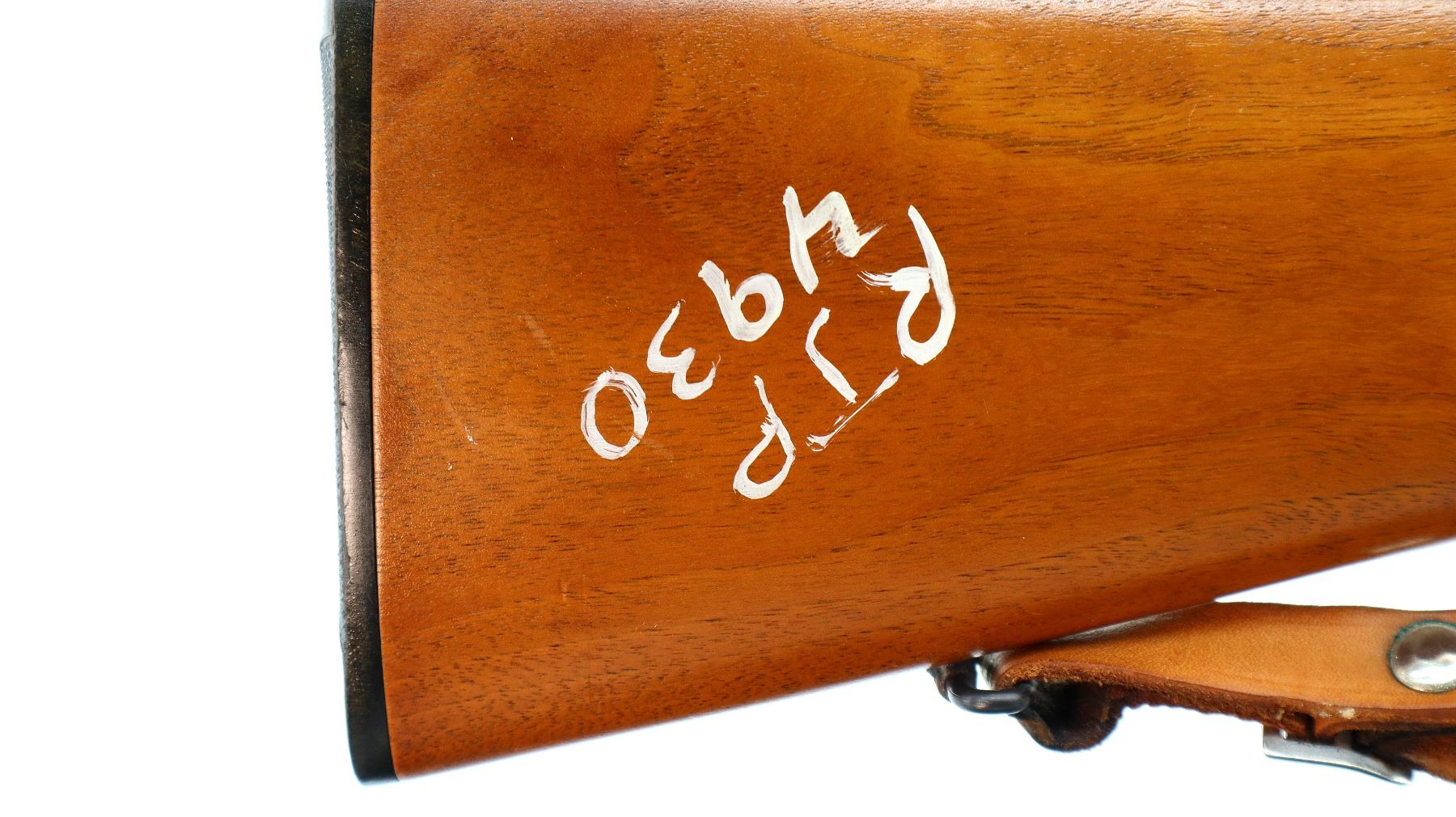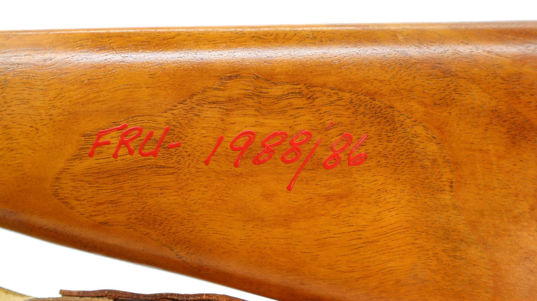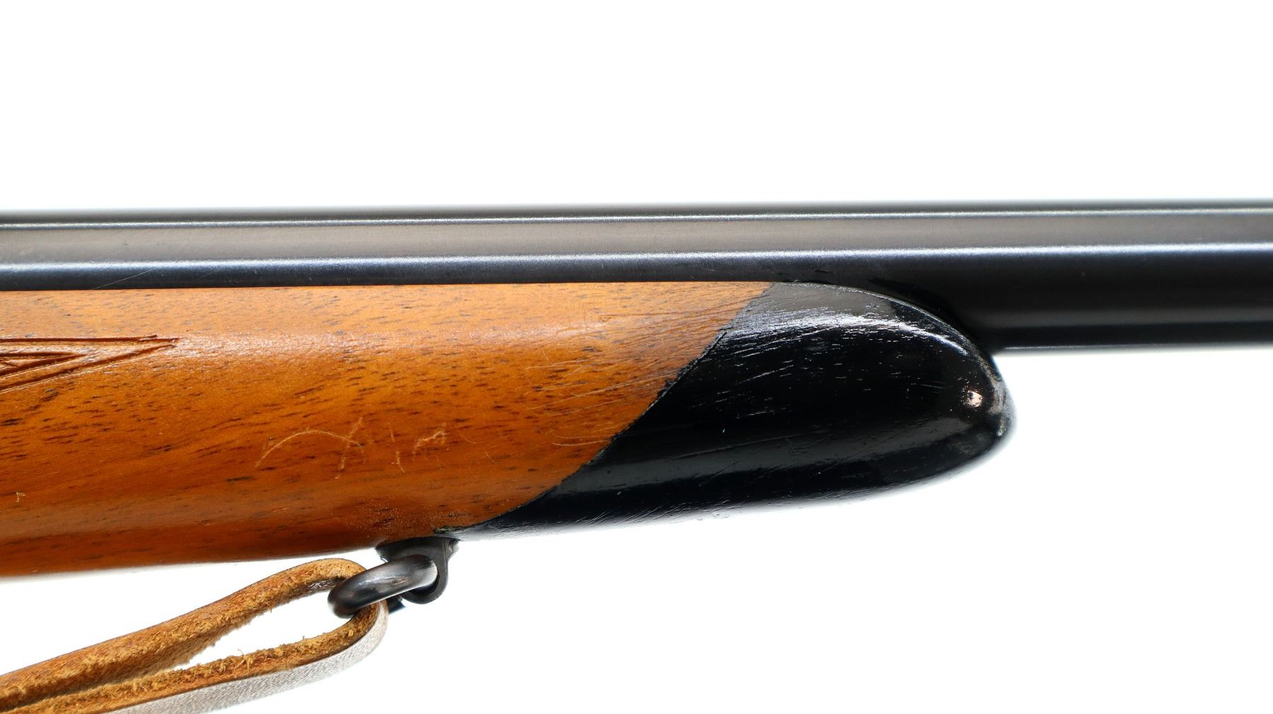 Main Description: Blade front sight with hood and ramp, missing rear sight dovetail present, blued finish, receiver has integral scope bases with Bushnell 10X Banner AO Scope installed, clear optics with duplex crosshair. Smooth bolt knob. One piece wood stock, black painted forend and pistol grip caps, checkered forearm, pistol grip and black polymer butt plate. Letters/Numbers painted in red on left side of stock, white paint on right side of stock. Double set triggers, sling swivels with brown leather sling.