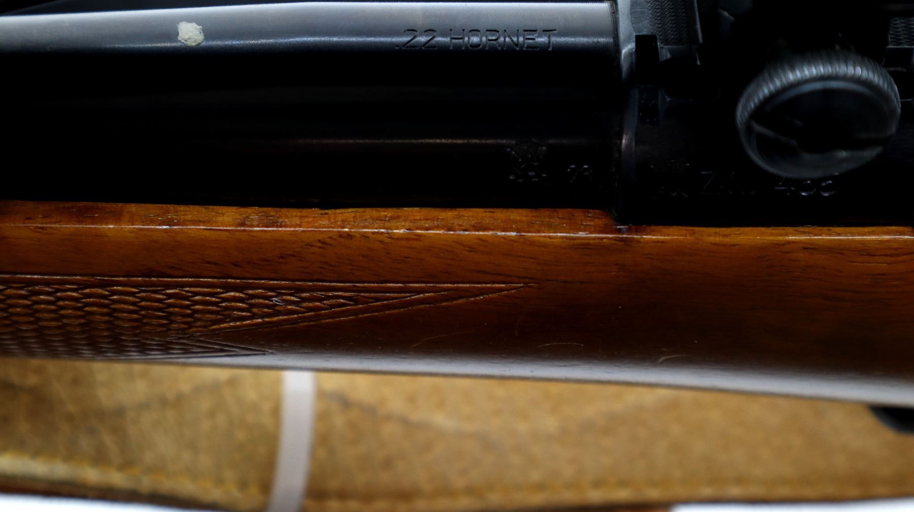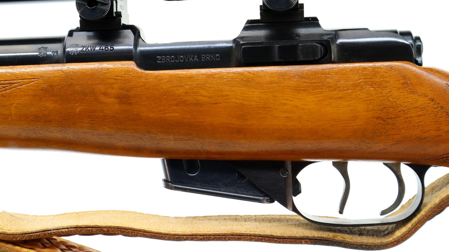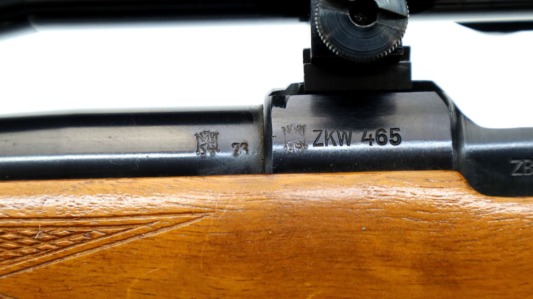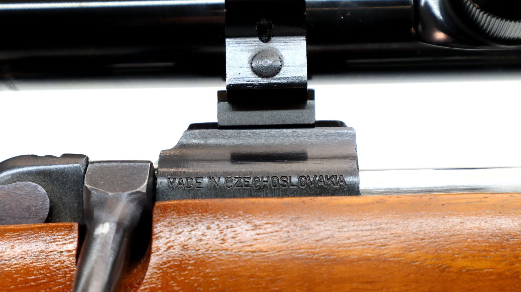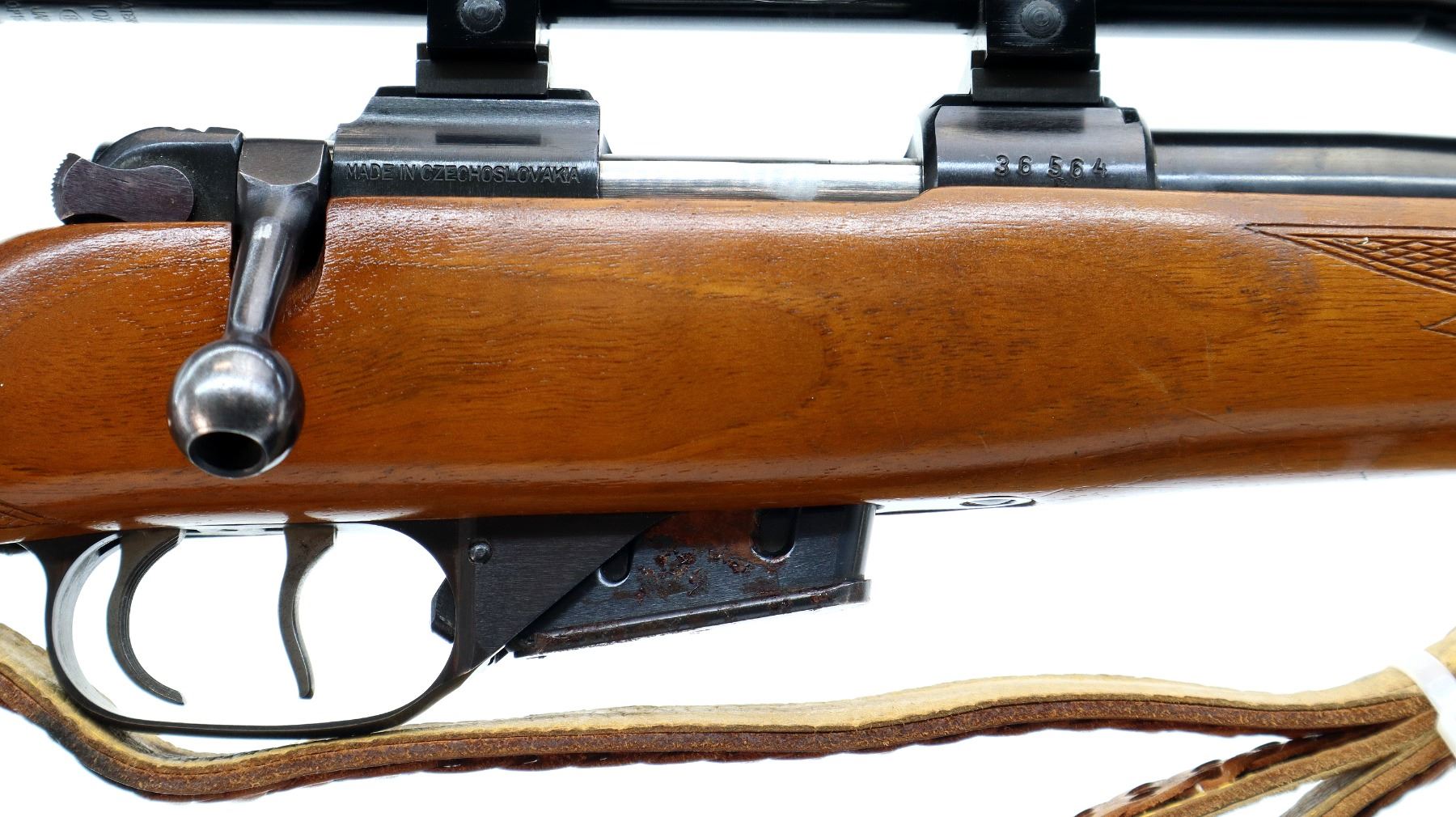 Main Description: Blade front sight with hood and ramp, missing rear sight dovetail present, blued finish, receiver has integral scope bases with Bushnell 10X Banner AO Scope installed, clear optics with duplex crosshair. Smooth bolt knob. One piece wood stock, black painted forend and pistol grip caps, checkered forearm, pistol grip and black polymer butt plate. Letters/Numbers painted in red on left side of stock, white paint on right side of stock. Double set triggers, sling swivels with brown leather sling.