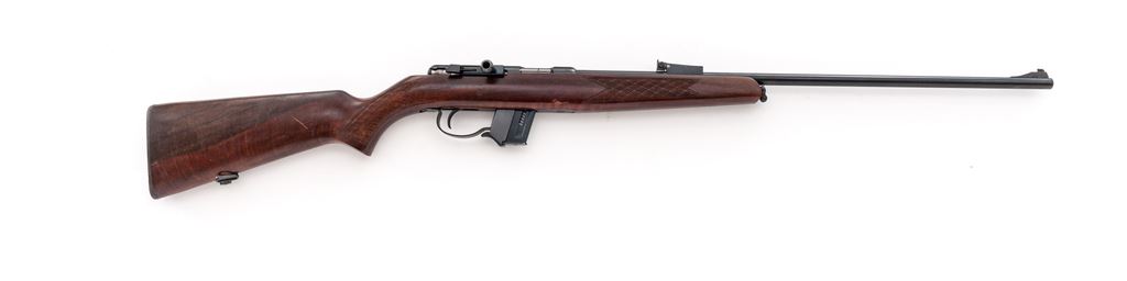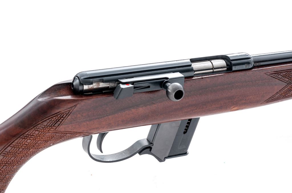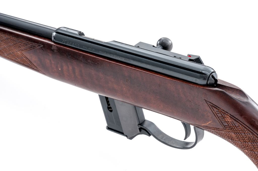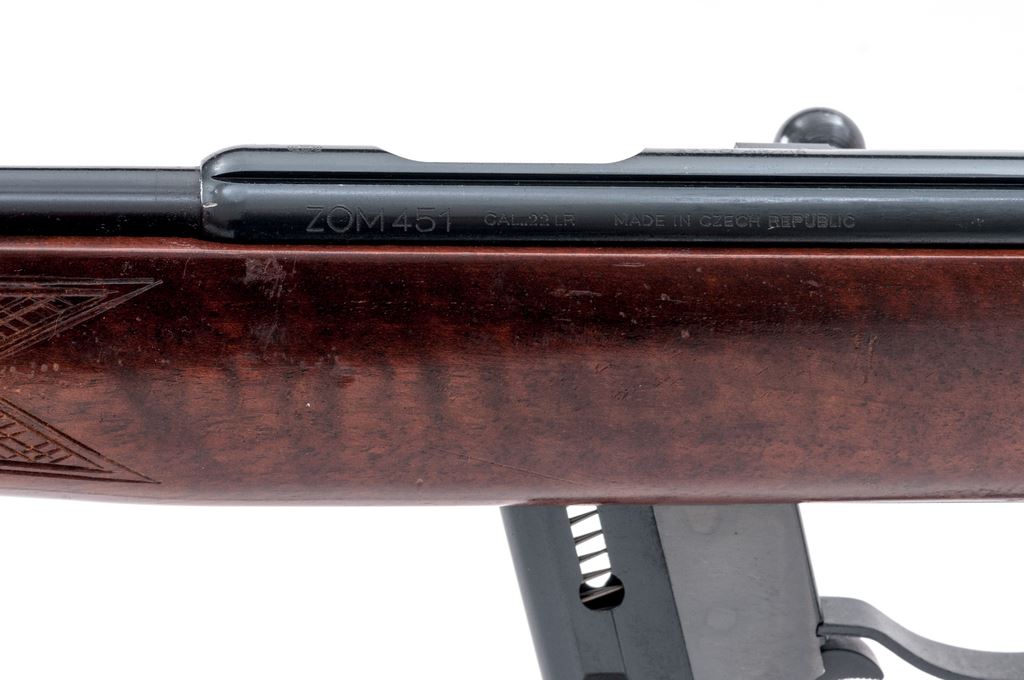 BRNO Model ZOM-451 Straight-Pull Rifle, #0988, .22 LR cal., 23'' barrel, blue finish, one-piece pistol-grip walnut stock with checkering at the wrist and forend, black composite CZ buttplate, and sling swivels. Blade front sight and fully adjustable notched rear sight, factory grooved receiver, bolt-mounted safety, and includes one magazine. Made in the Czech Republic. Bottom of barrel is import marked. Metal is near excellent retaining approx. 98% blue. Factory lettering, proofmarks, etc. are clear. Top of barrel in front of rear sight with a noticeable scratch. Stock is good with general scuffs, surface dents and scratches; edge of pistol grip is chipped. Good action, bright bore with excellent rifling. Est.: $125-$225. (Modern)
