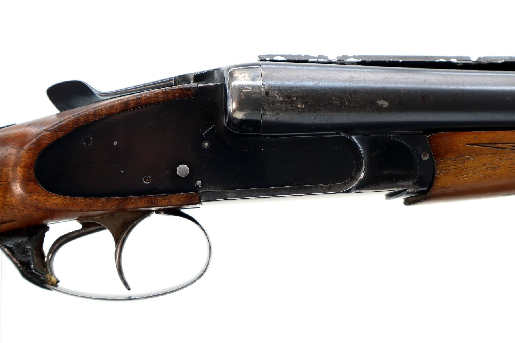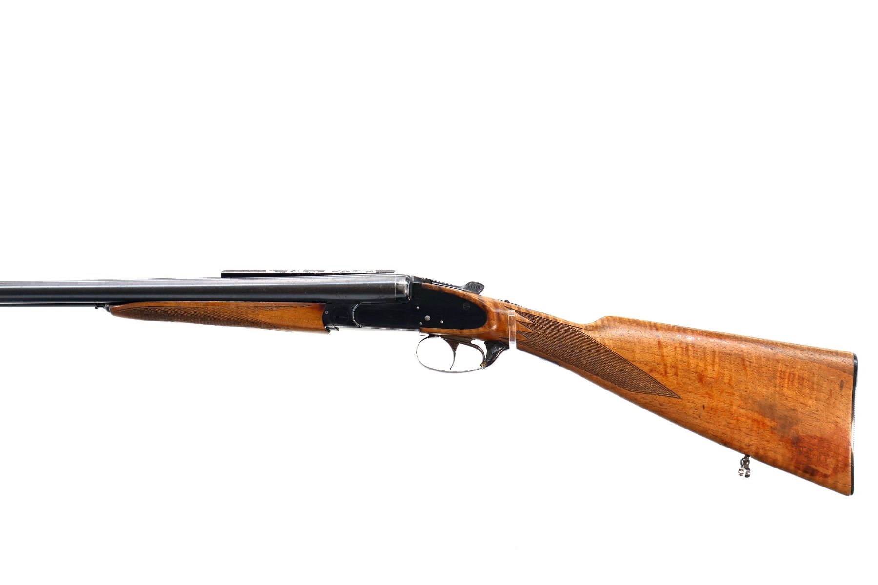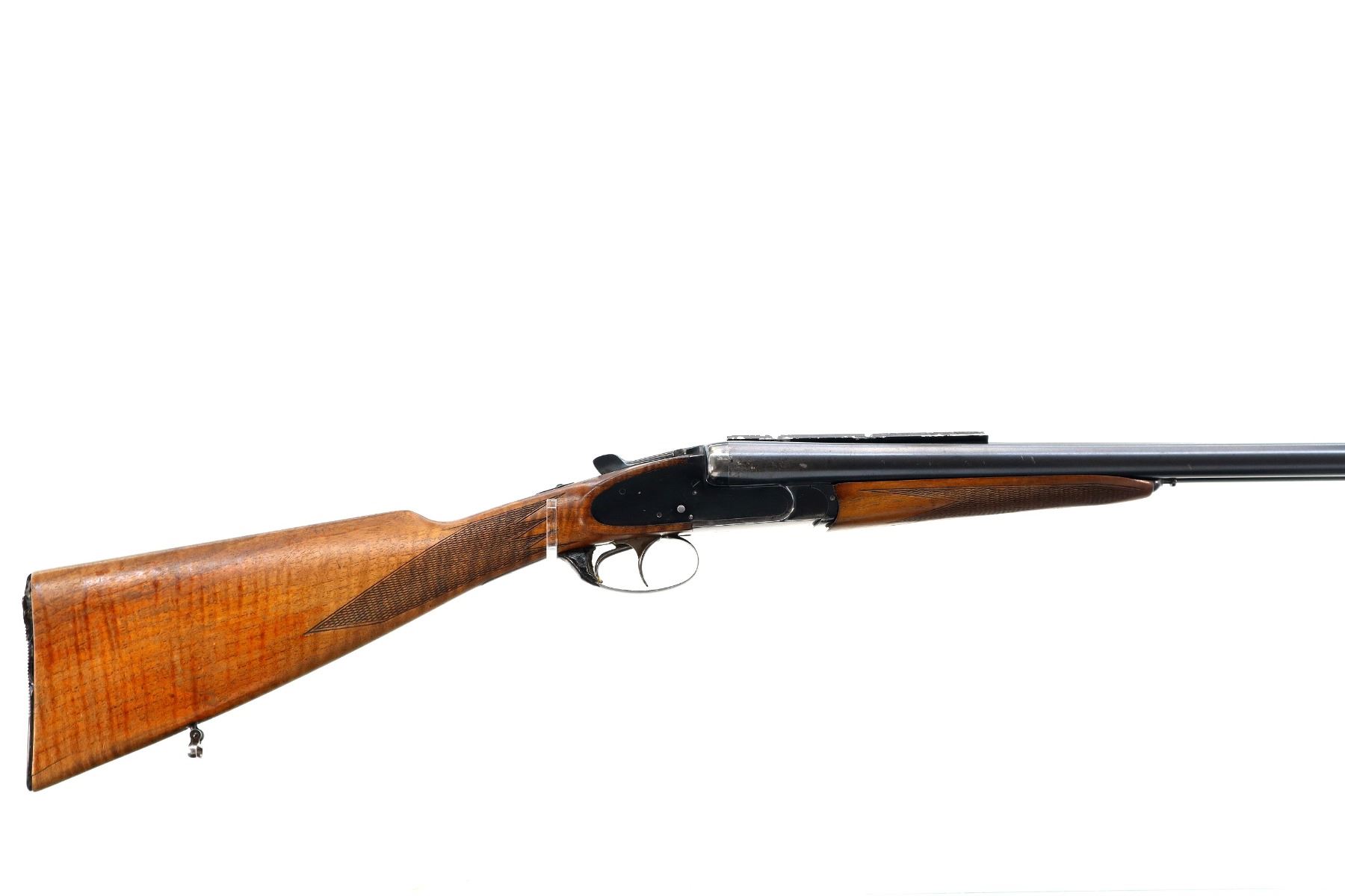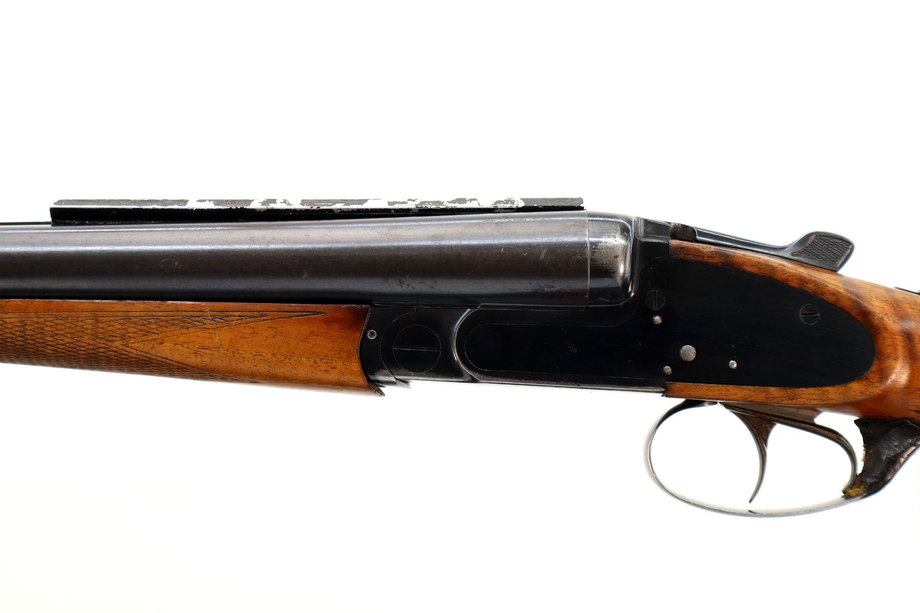Main Description: Brass bead, blued finish, solid rib drilled and tapped with one piece scope rail installed, automatic safety, ejectors, side locks, double triggers. Two piece wood stocks, checkered forearm and straight grip, grooved black polymer butt plate which is broken, stock cracked at toe, sling swivels, left barrel has some small dents.