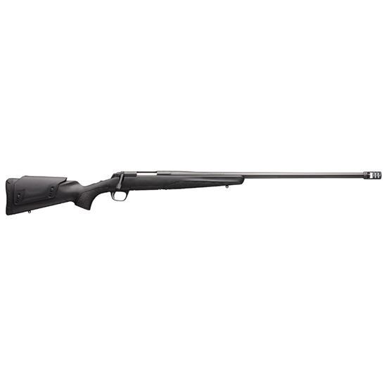 Bolt-action rifle designed for long range shooting with high strength steel receiver, heavy sporter contour barrel, removable muzzle brake, removable magazine, top-tang thumb safety, extended bolt handle, black composite stock with adjustable comb.