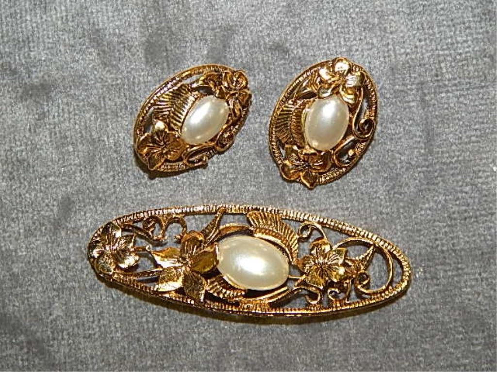 BROACH AND EARING SET - PIERCED - SILVER TONE WITH PEARL STYLE ACCENTS