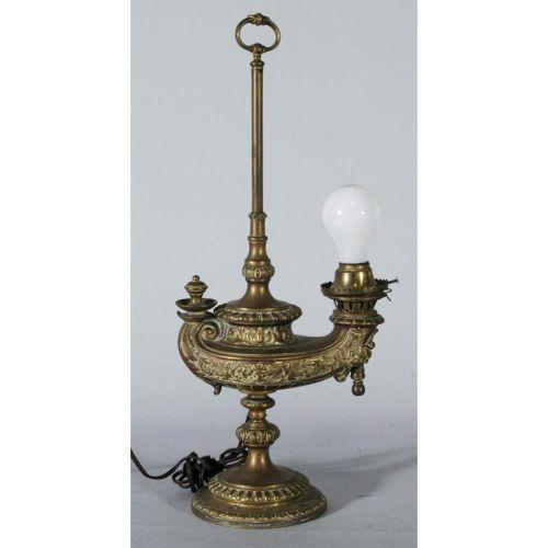 BRONZE ALLADIN OIL LAMP, probably by Harvard, 20" high overall, late 19th century, CONDITION REPORT: lacking two fitter screws., Subject to our Terms and Conditions, PACKING/SHIPPING within continental U.S. excluding insurance (which is required) will be handled by Fairfield Auction for $50,