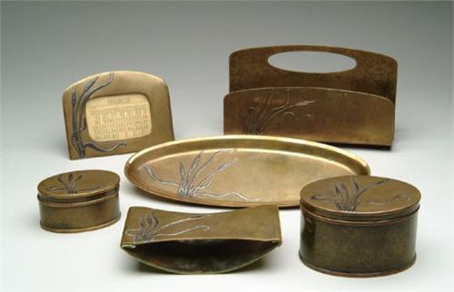 BRONZE AND SILVER DESK SET. Beautiful naturalistic desk set has simple bronze background with applied sterling silver cattails. The set consists of letter holder, pen tray, stamp box, inkwell, calendar and rocker blotter. Marked on the underside with Heinz logo and "Sterling on Bronze Pat. Aug 17 12". CONDITION: Very good to excellent. 5-61537