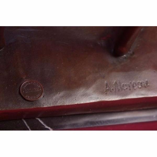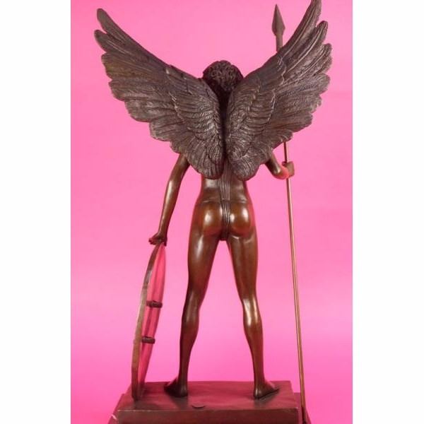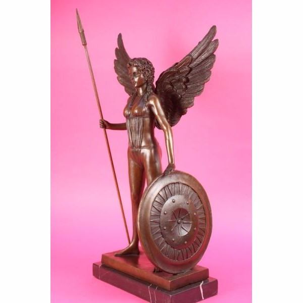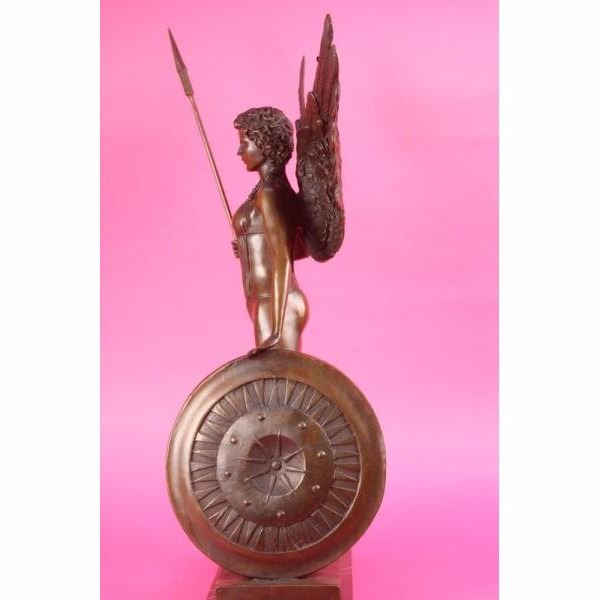 An Amazon warrior stands boldly, staring her enemy in the eye. She comes from a supernatural world and fights the immortal creatures that ravage it. She is armed with a tall spear and shield. Her spear is planted on the ground beside her, while she rests a hand on her shield. She wears a suit that clings to her curves. Her wings extend behind her.100% bronze and handmade, this brown patina sculpture was cast using the "Lost Wax Method" and mounted on a marble base and is signed A. Moreau. Condition: This sculpture is in perfect condition. Bronze Dimensions with Marble Base:Height 21" x Width 10" Marble Dimensions:9" X 5" Height without base: 20" Weight : 20 LBS Inventory : 44DS2256544