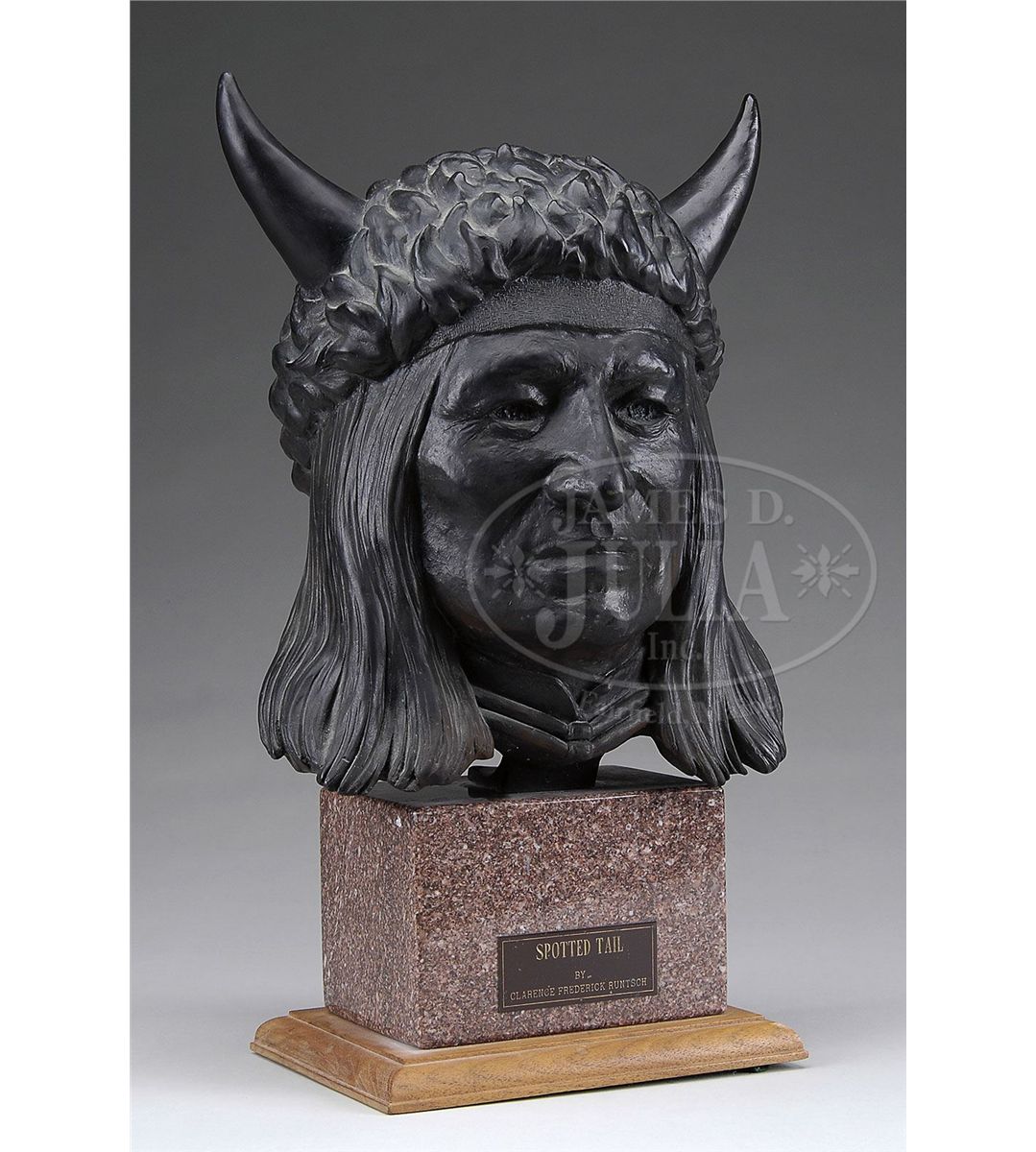 This small edition Clarence Runtsch sculpture measures just over 18" sitting on an 8"x6" wooden base. This bronze bust is signed and dated 1989. Bronze bust itself weighs 35 lbs. Spotted Tail was a Lakota chief who was a great warrior in his youth but was among the first great chiefs to understand white expansion was inevitable. One of the first big Indian reservation agencies was named for him and existed during the Indian wars of the 1870's while George Armstrong Custer was making his name known. Spotted Tail was killed by another Indian in 1881. CONDITION: Bronze and base overall are in very good condition as can be seen in photos. 8-76309 JS57